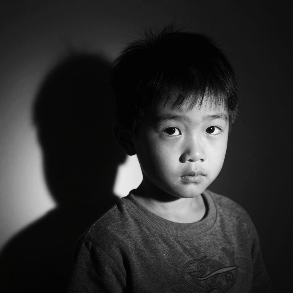 Monochrome close-up portrait of a young Asian boy with short black hair, wearing a casual grey t-shirt. The photograph uses dramatic, low-lit lighting to create strong shadows and highlights, emphasizing the boy's expressive face and innocent gaze. The shadow cast on the wall behind adds depth and intensity to the image, giving it a timeless and cinematic quality.