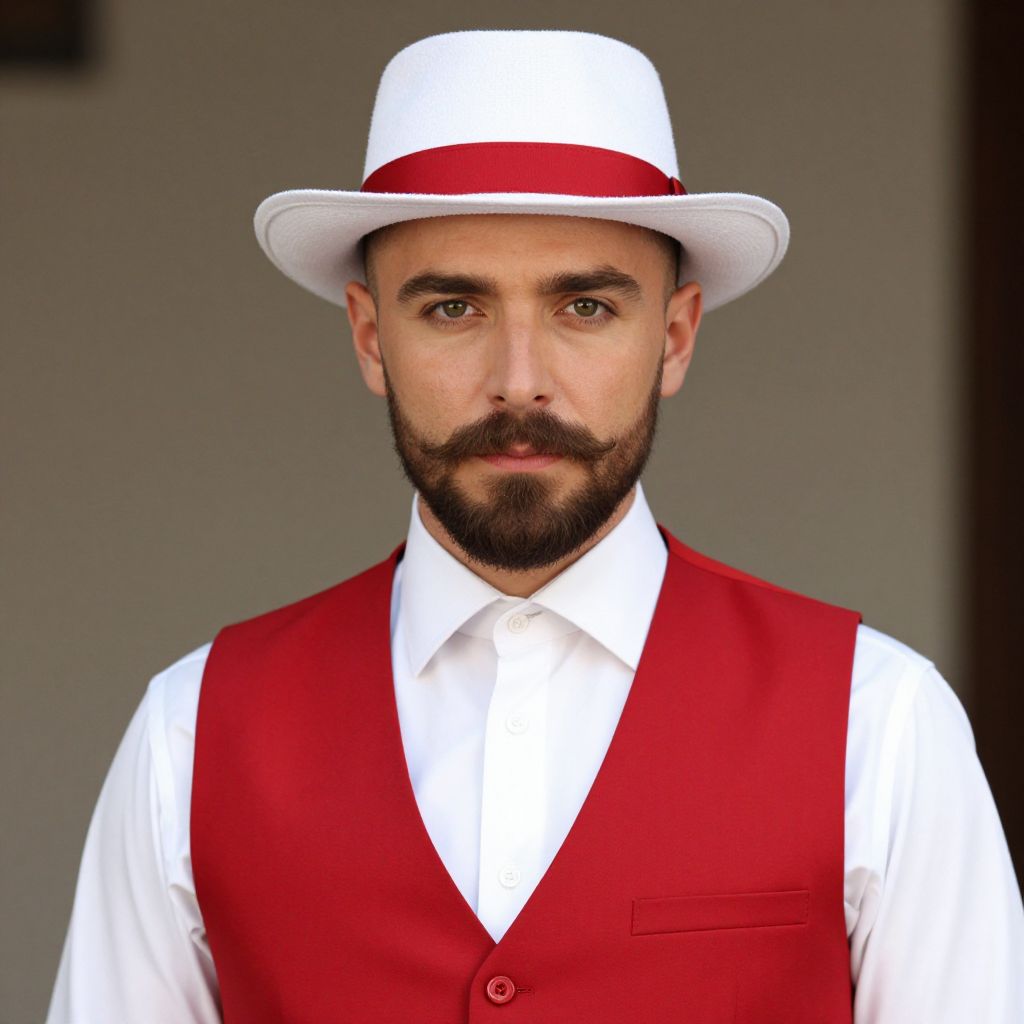 Portrait of a charismatic man in his late 30s with a neatly trimmed mustache and full beard, wearing a crisp white shirt and a vibrant red vest. He dons a stylish white hat with a red ribbon, looking directly at the camera with a confident gaze against a neutral background.