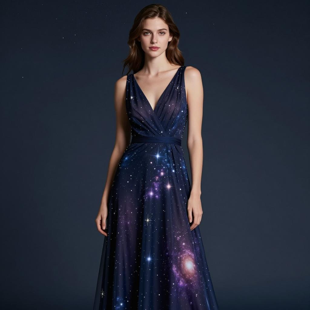 Constellation prom dress, photograph of a beautiful young woman, wearing a dark blue and purple galaxy-inspired, sleeveless, V-neck evening gown, with a fitted top and flowing skirt, wavy brown hair, fair skin, standing against a starry night sky background, elegant and serene expression, soft lighting, realistic and detailed, fashion photography style