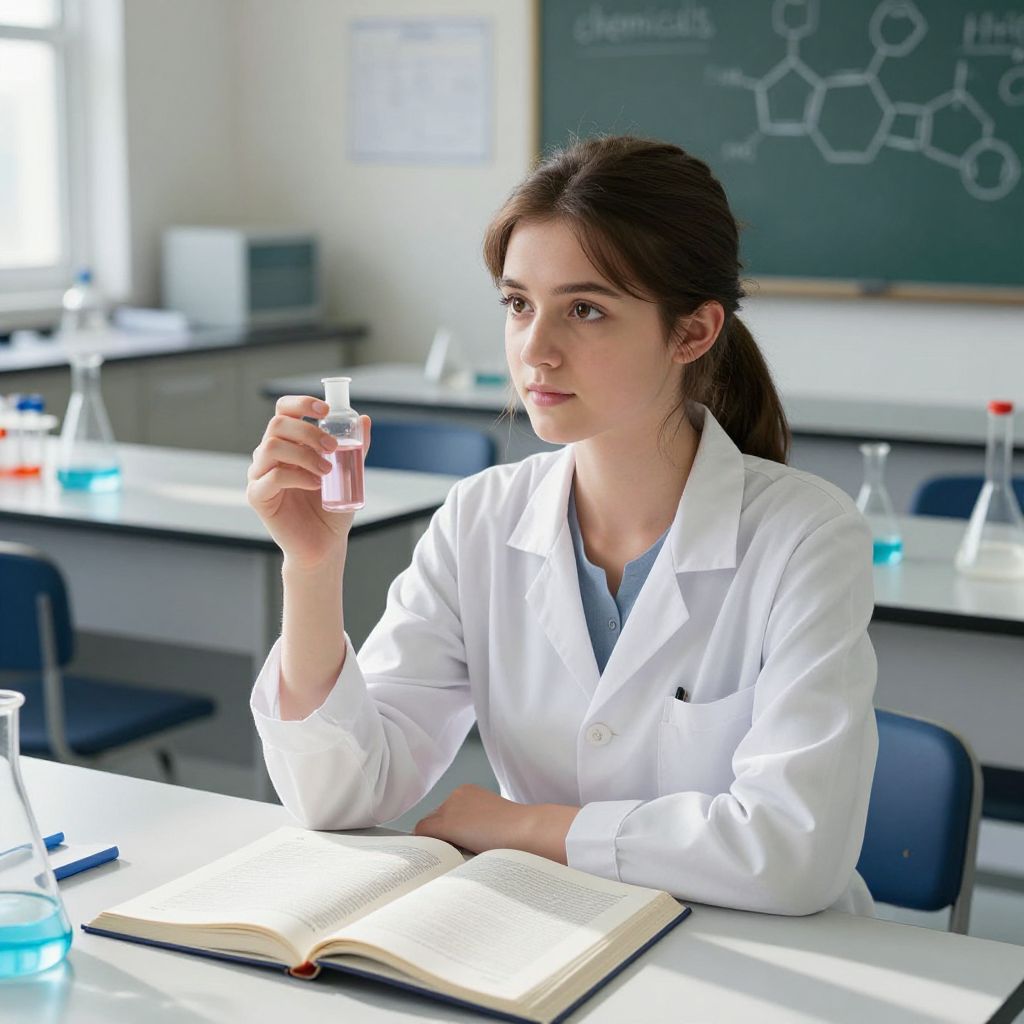 A serene yet grounded photo of a young woman with soft brown eyes and fair skin, sitting calmly at a sunny chemistry desk in a university teaching lab, holding a vial of liquid with a faint pink hue, textbooks open beside her, a white apron over her lab coat, the background showing clean tables, glassware, and a chalkboard with diagrams of chemical reactions, the keyword 'chemicals' present through the visible substances and scientific tools.