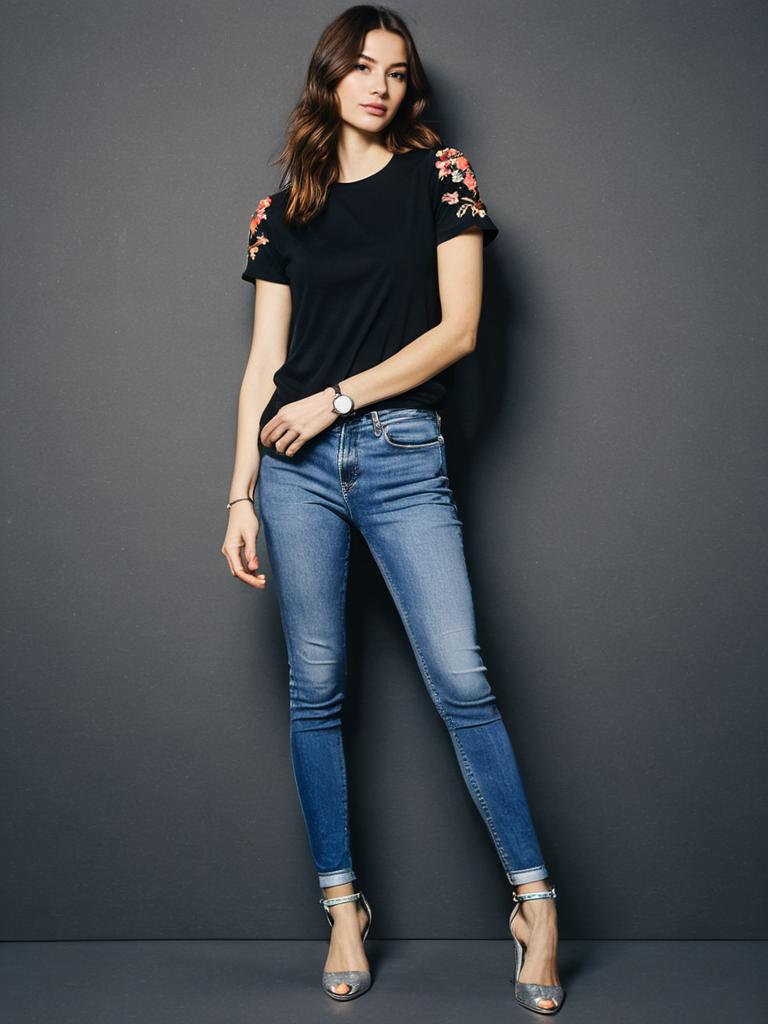 Woman, casual chic, black t-shirt with floral embroidery on the shoulders, short sleeves, blue mid-wash skinny jeans, silver ankle strap heels, delicate silver watch, grey studio background --sref 1399