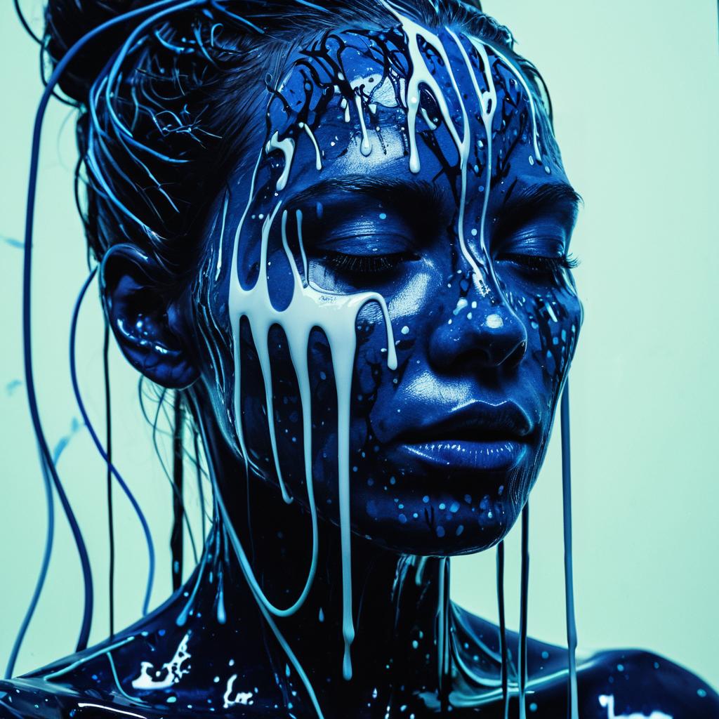 Close-up portrait of a woman with midnight blue skin and silver liquid paint dripping over her face and neck. The surreal, airbrushed style features melting liquid strands with neon soft glow, creating an abstract, biopunk-inspired visual effect. The subject's eyes are closed, enhancing the introspective mood of this high-resolution artistic image.