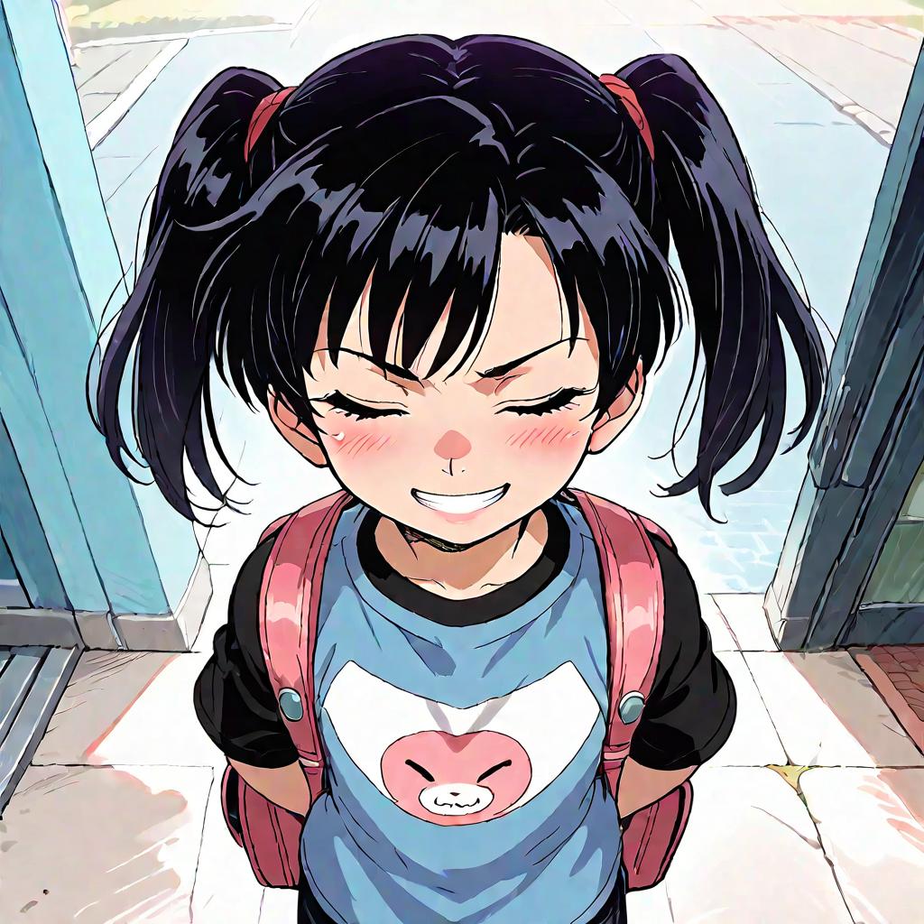 Score_9, score_8_up, score_7_up, source_anime, solo, 1girl, child, twintails, black hair, t-shirt, long pants, standing, half closed eyes, grin, from above, hands on hipsrandoseru, backpack, 1, 0, 0> (nora higuma:0.8), (null (nyanpyoun):0.8), (neisan:0.8), (anime screencap, anime coloring, megami magazine, yumekawaii:1.1)