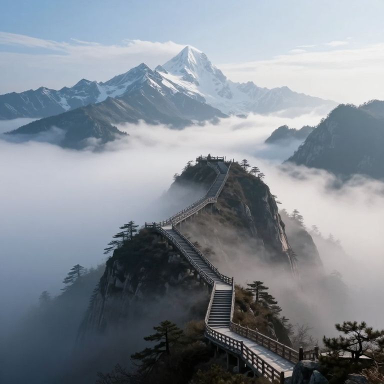 Staircases ascend majestically through misty valleys, connecting jagged peaks shrouded in ethereal clouds, where snow-capped summits rise triumphantly against a serene sky.