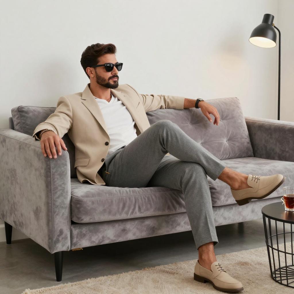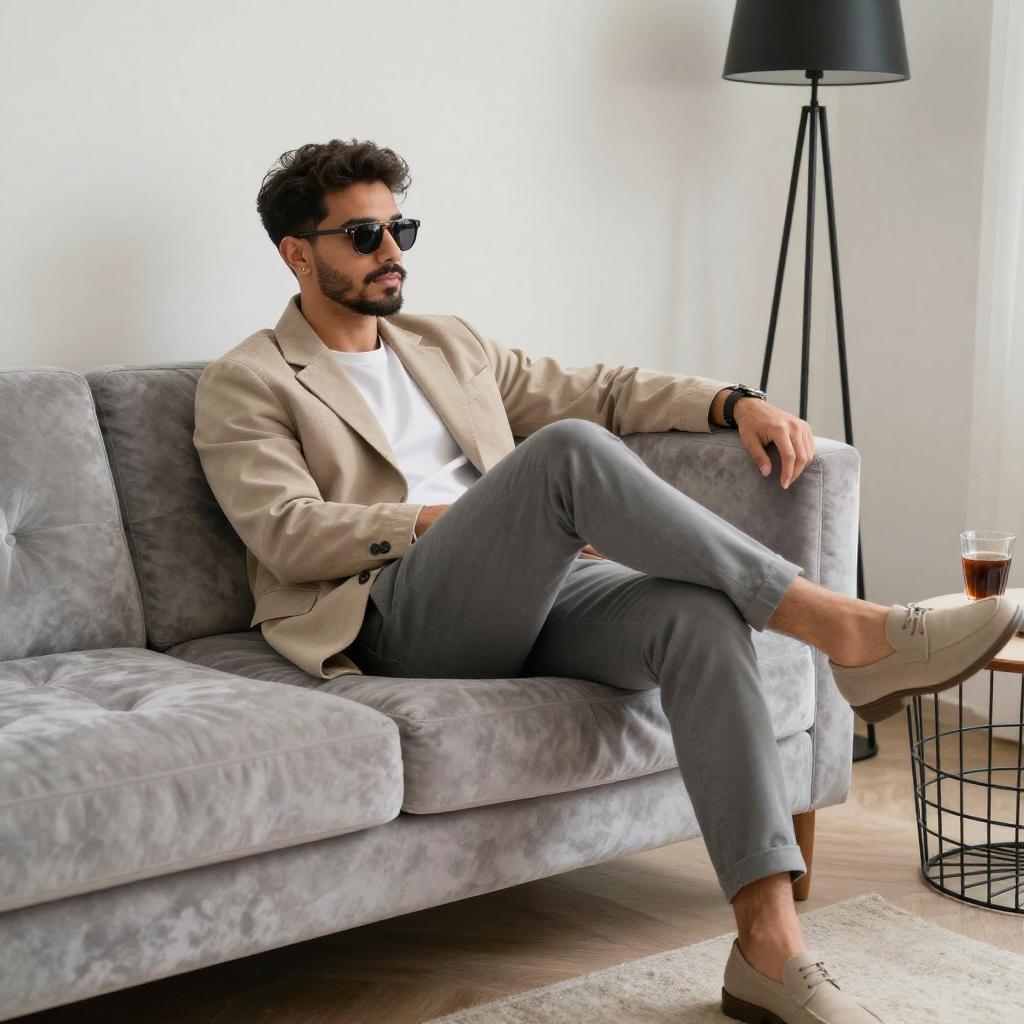 Photograph of a stylish, dark-haired man with a trimmed beard and sunglasses, lounging on a tufted, light gray velvet sofa. He's wearing a beige blazer, gray pants, and beige shoes. His left arm rests on the sofa's armrest, while his right leg is crossed over his left. A modern black floor lamp and a wireframe coffee table with a glass and a drink are in the background.
