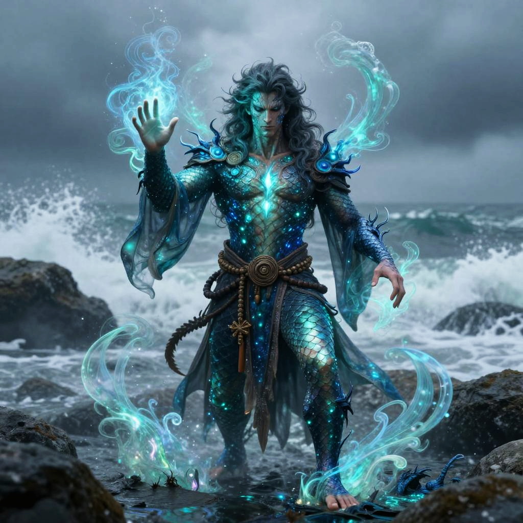 Simic hybrid male magician casting a powerful spell, swirling magical energy with aquatic motifs, blue and green hues illuminating his scaled skin, wearing robes embedded with bioluminescent elements, standing on a rocky shore with mist and crashing waves in the background.