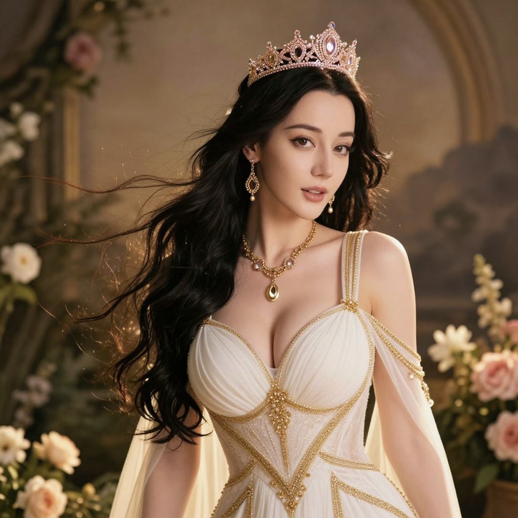 A beautiful woman with long, flowing black hair, big tits and a sexy, alluring presence, is wearing a elegant white dress with golden accents and a delicate gold necklace. She has a majestic crown on her head, shimmering with tiny gemstones, and exquisite gold earrings that catch the light as she stands gracefully in a luxurious, moonlit garden. The atmosphere is dreamy and enchanting, with soft golden hour lighting, flowers blooming around her, and a sense of royal elegance and mystery.