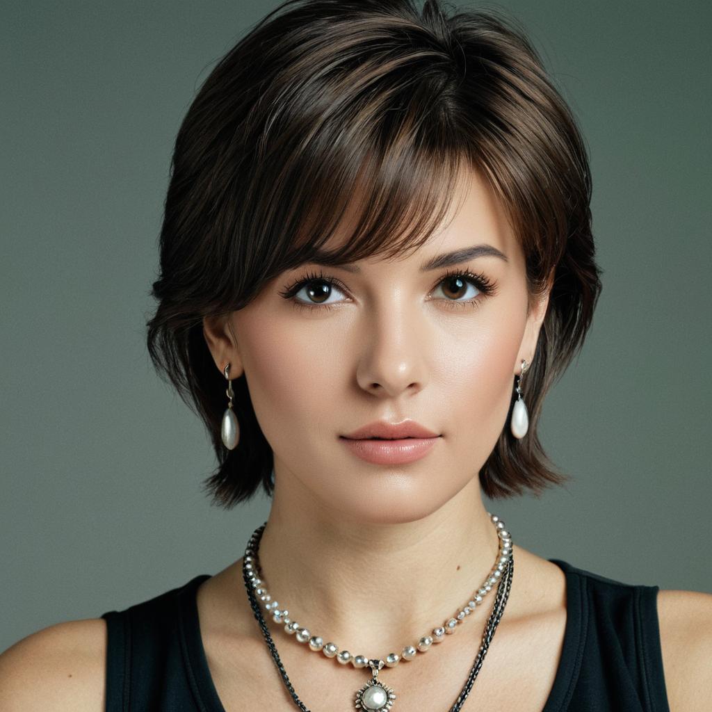 Close-up portrait of a young woman with short brown mullet haircut, green eyes, and natural makeup. She is wearing pearl drop earrings and two layered necklaces featuring silver and pearl beads, dressed in a sleeveless black top, photographed against a neutral grey background.