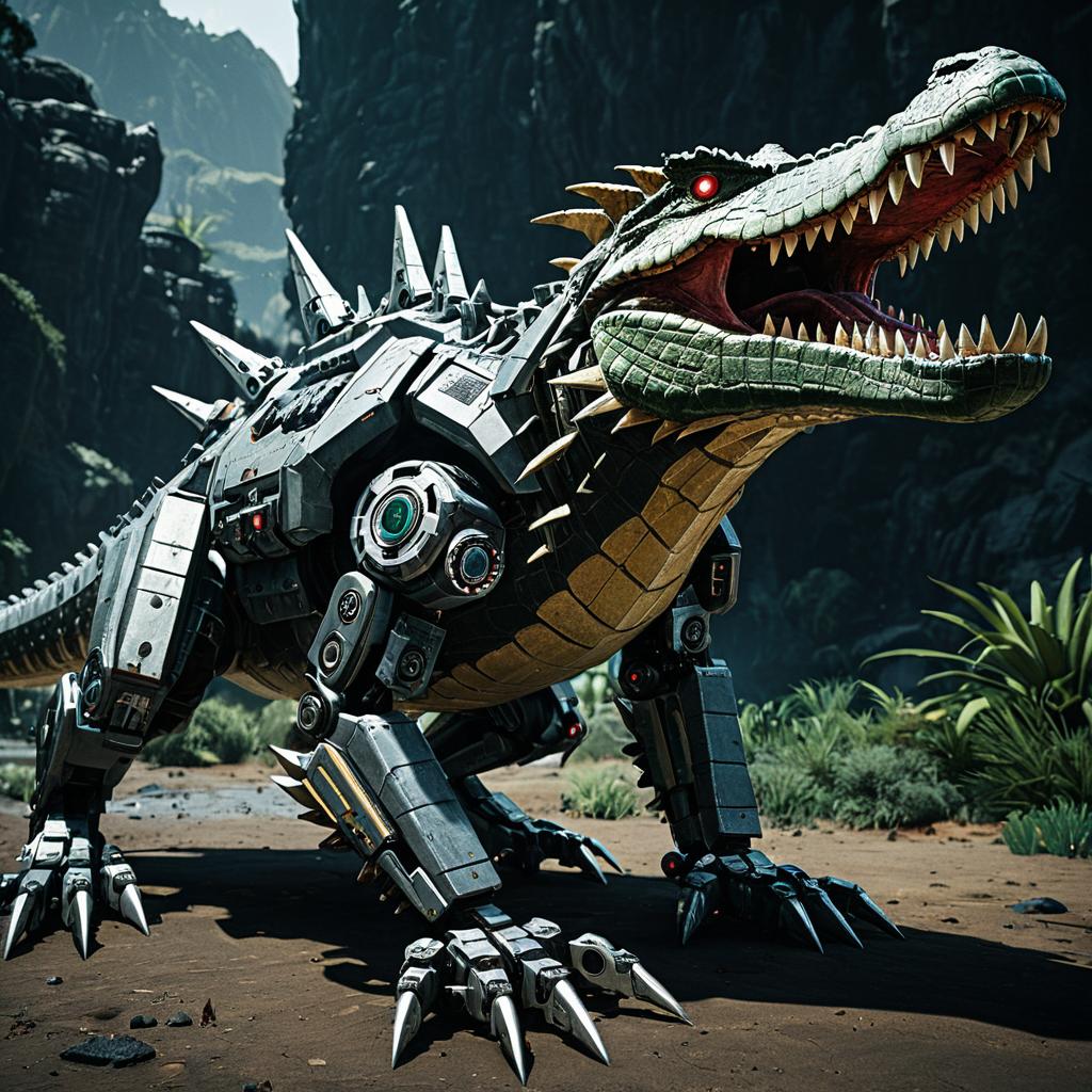 Detailed 3D rendering of a robotic crocodile mecha inspired by the Snapmaw from Horizon Forbidden West, featuring electromagnetic pulse elements and mechanical spikes. The mechanical creature stands in a rocky canyon environment with vegetation, showcasing intricate metallic textures and global illumination effects.