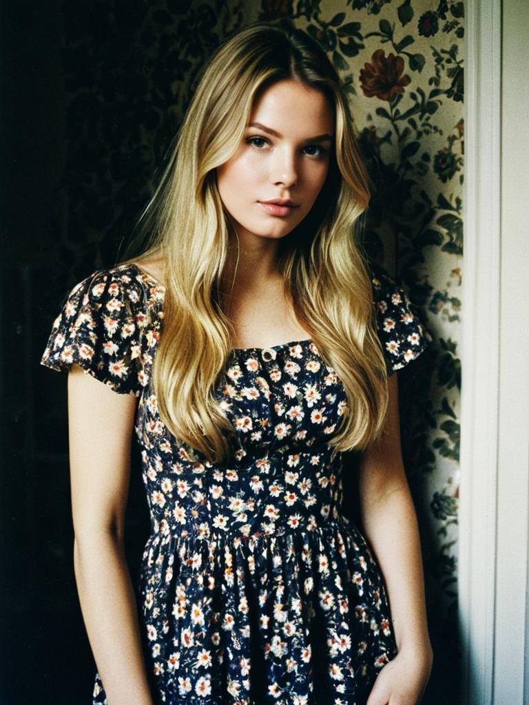 Portrait of a young blonde woman with a long braid, wearing a sleeveless blue patterned dress, standing outdoors near a campfire with a blurred forest background. She is looking directly at the camera with a neutral expression.