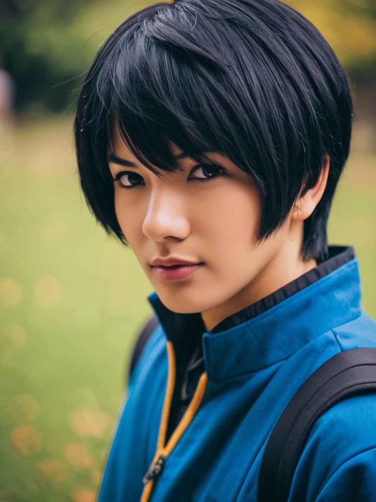 Photo-realistic cosplay photo of person in akaashi keiji costume. 1boy, blue eyes, very short hair, black hair, short hairlifestyle stock photo, shallow depth of field, lifestyle stock photography, shallow depth of field, natural lighting, warm tones, soft background blur, candid moments, vibrant colors, realistic textures, modern casual clothing. full body shot