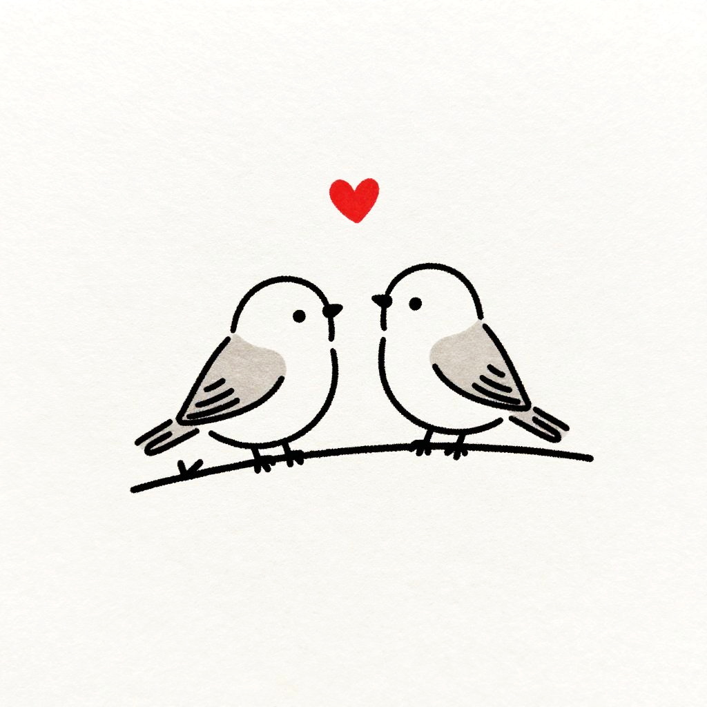 Two small birds drawn in minimalist sketch style sitting on a thin branch, simple hand drawn lines, subtle paper texture background, a small red heart above them conveying love, muted monochrome colors with a touch of red color accent, delicate and charming