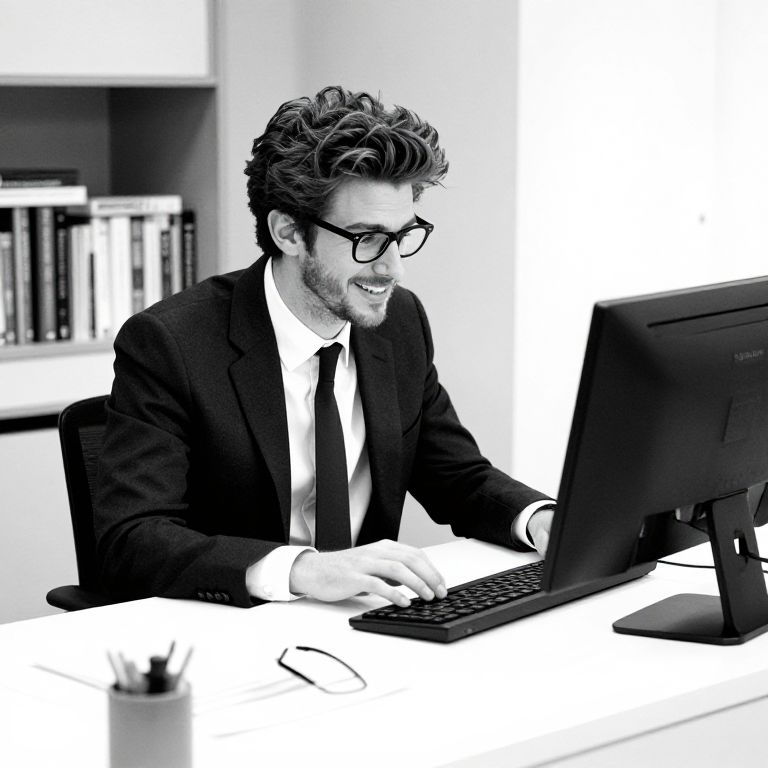 High angle shot, a man dressed in avant-garde fashion designs, intricately drawn on paper, surrounded by pencils, sketchbooks, and artistic tools, set against the timeless elegance of black and white film, soft focus, subtle grain, moody lighting, monochromatic palette, bold lines, abstract shapes, dynamic composition. Man has masculine face and piercing eyes