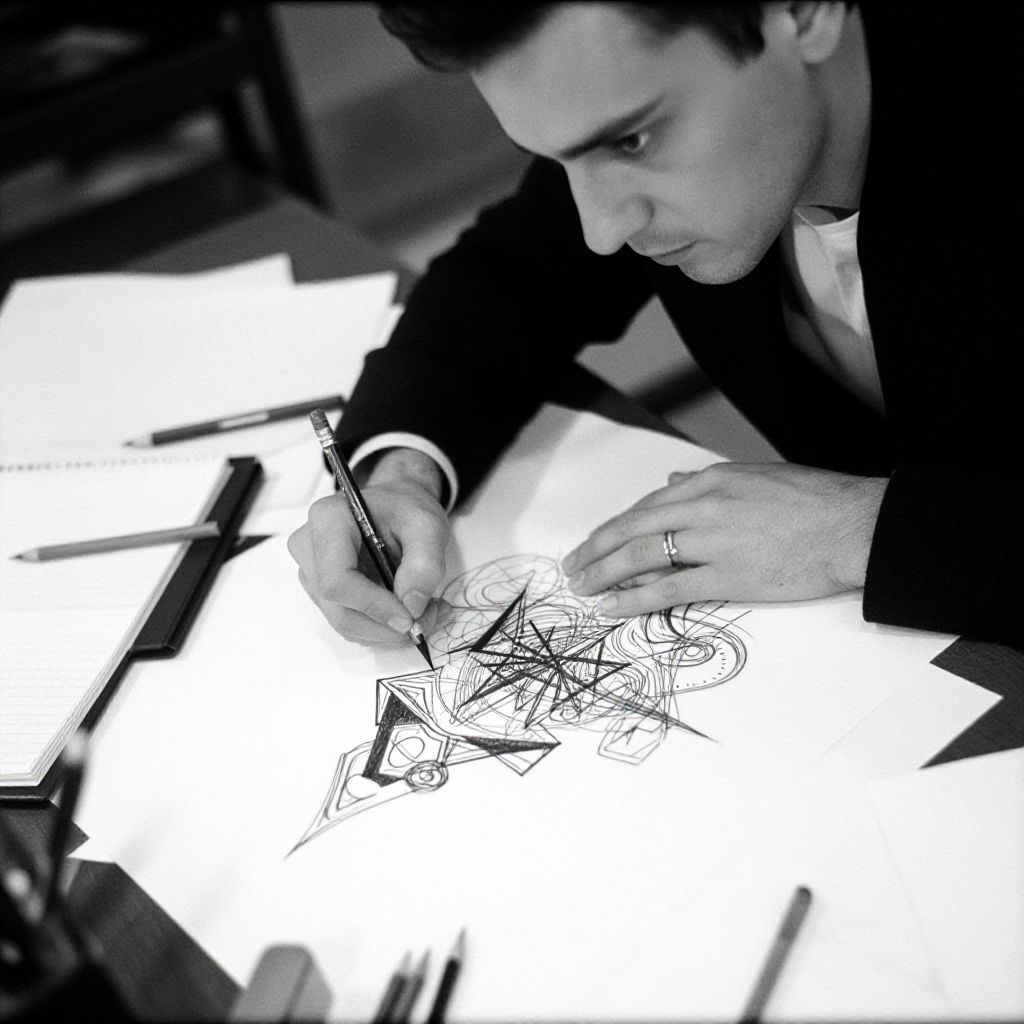 Black-and-white photograph of a focused man in a suit, intently drawing intricate lines with a pen on a glowing illuminated table.
