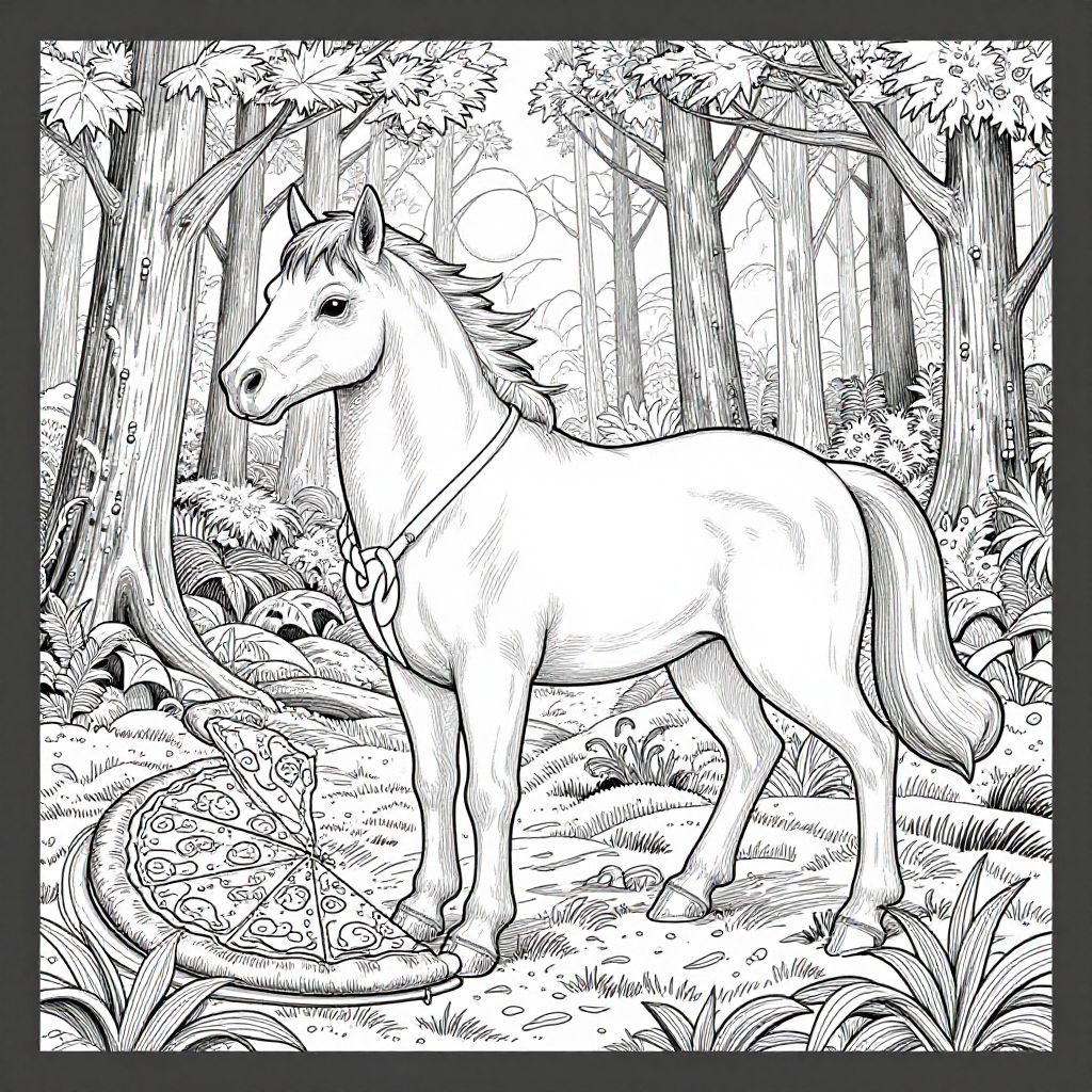 "Centaur Complex Dark Fantasy adult coloring page, stencil on a clear background, forests fantastical slices of pizza, magic,"