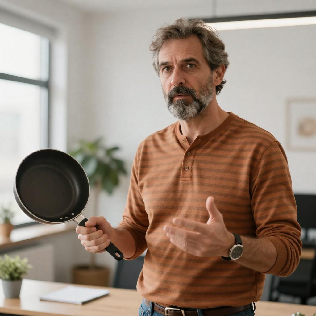 Photograph of a middle-aged man with a beard, wearing a striped orange and brown shirt, holding a frying pan in his right hand and gesturing with his left. He stands in a modern office with large windows, green plants, and bright natural light. His expression is serious and focused.