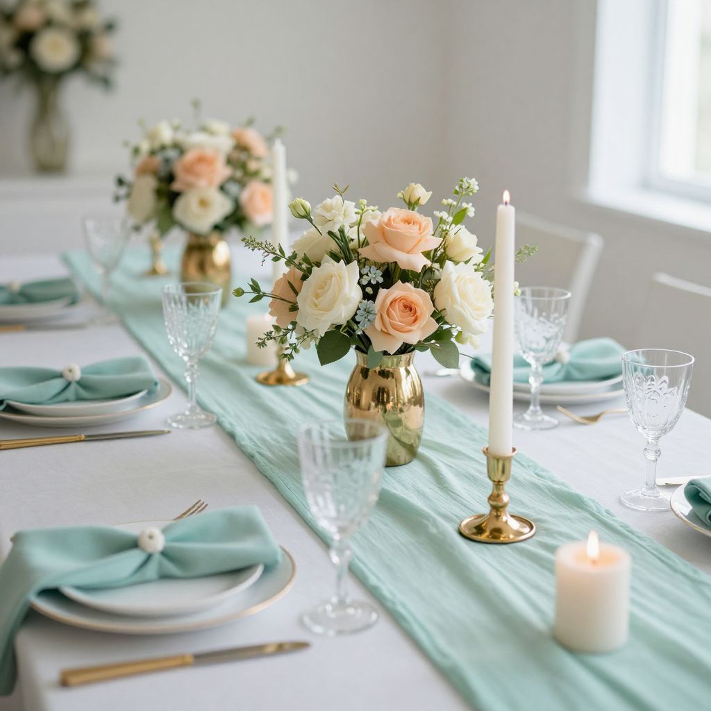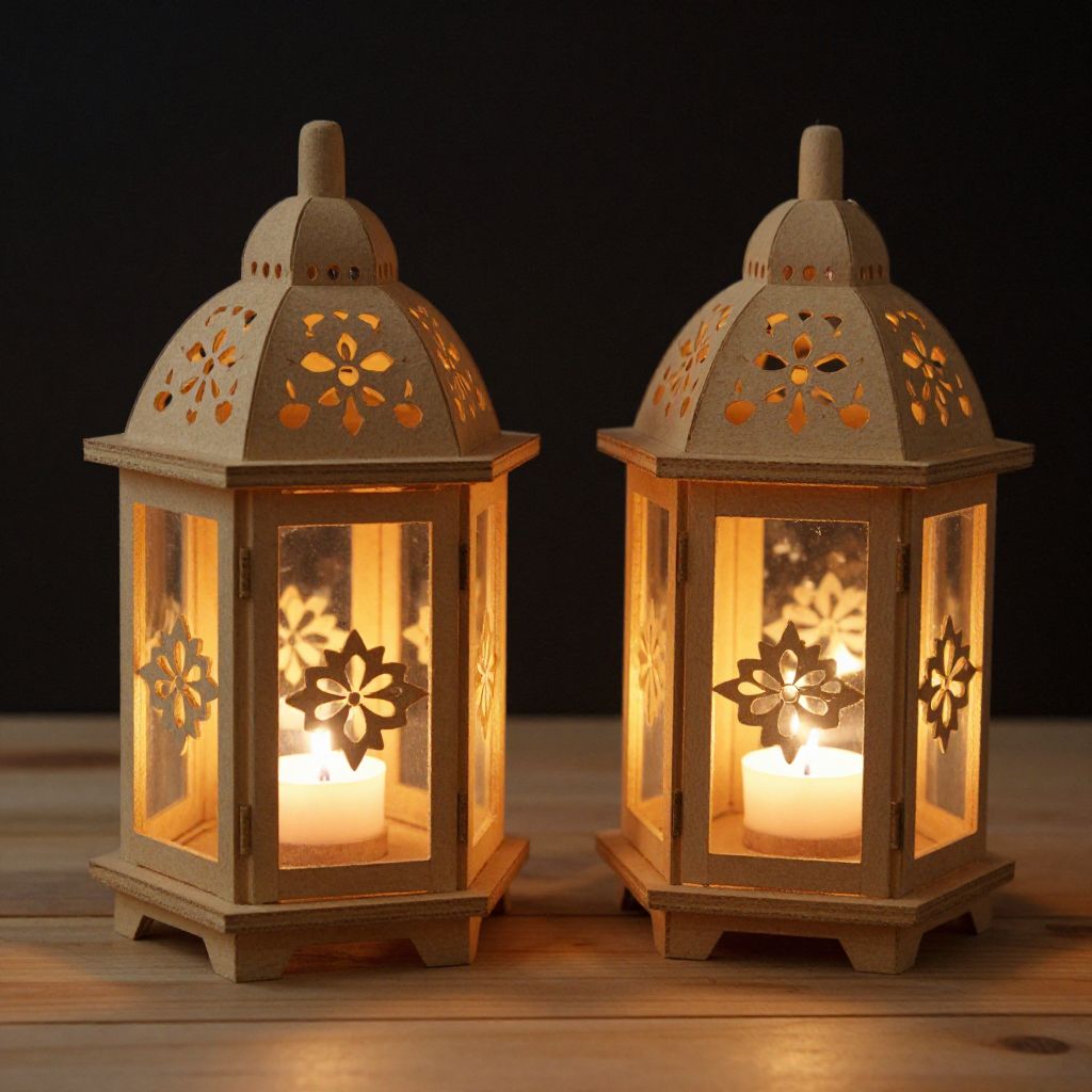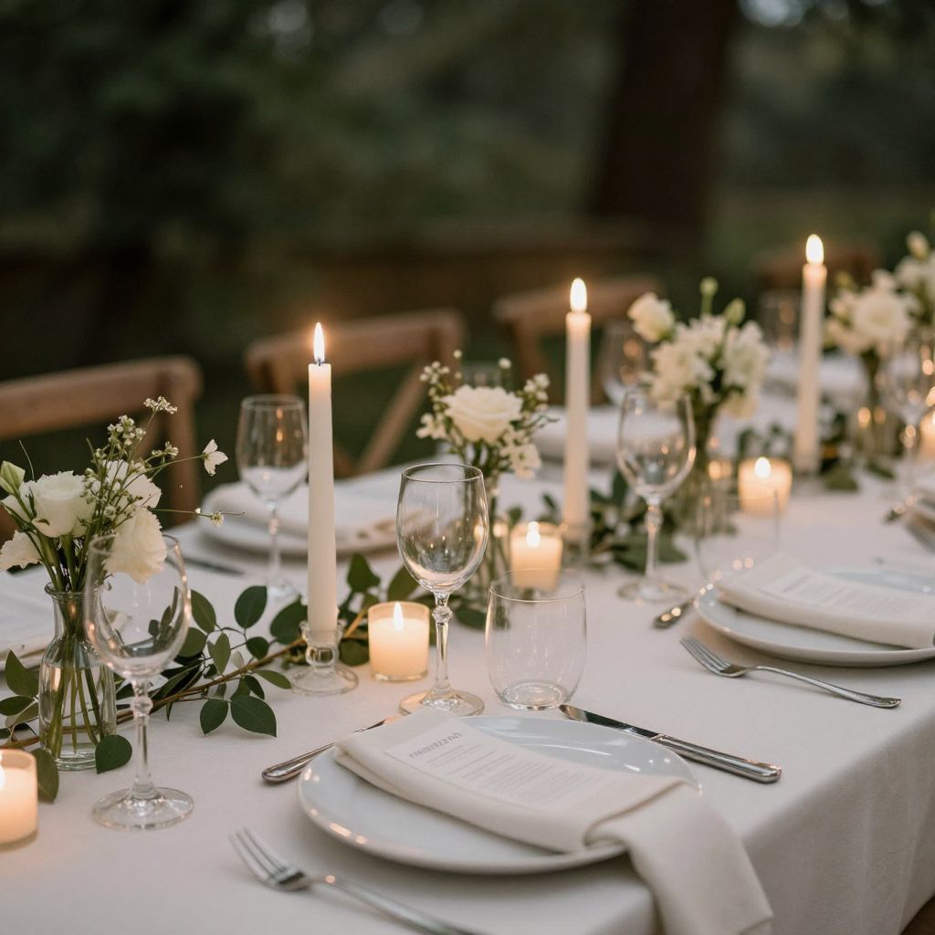Photograph of three vintage brass lanterns with lit white candles, arranged on a white tablecloth, creating a warm, elegant ambiance.