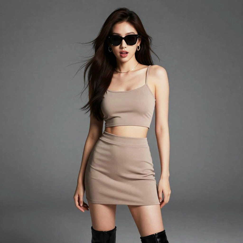 Bohemian woman wearing metallic bronze knee-high boots, posing in a rooftop garden at twilight