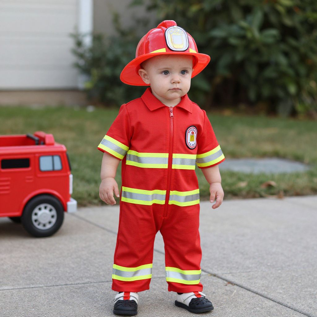 Fire Truck Toddler Costume, baby dressed in a fireman costume standing up