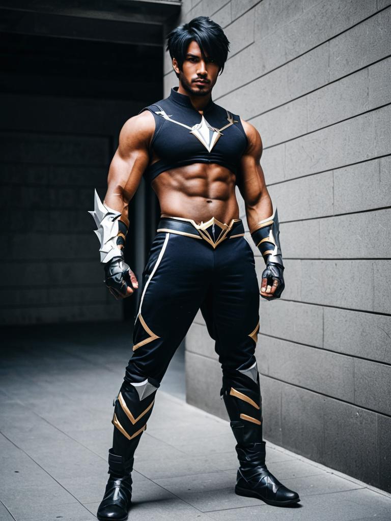 Photo-realistic cosplay photo of person in arash (fate) costume. 1boy, dark-skinned male, black eyes, black hair, short hair, muscular male, bara, abs. full body shot