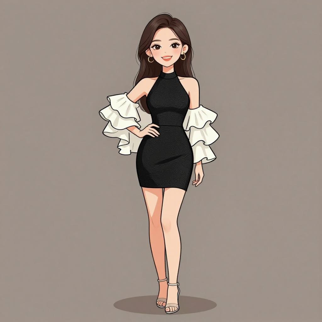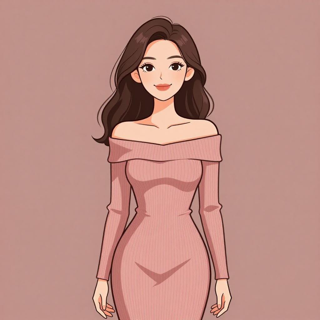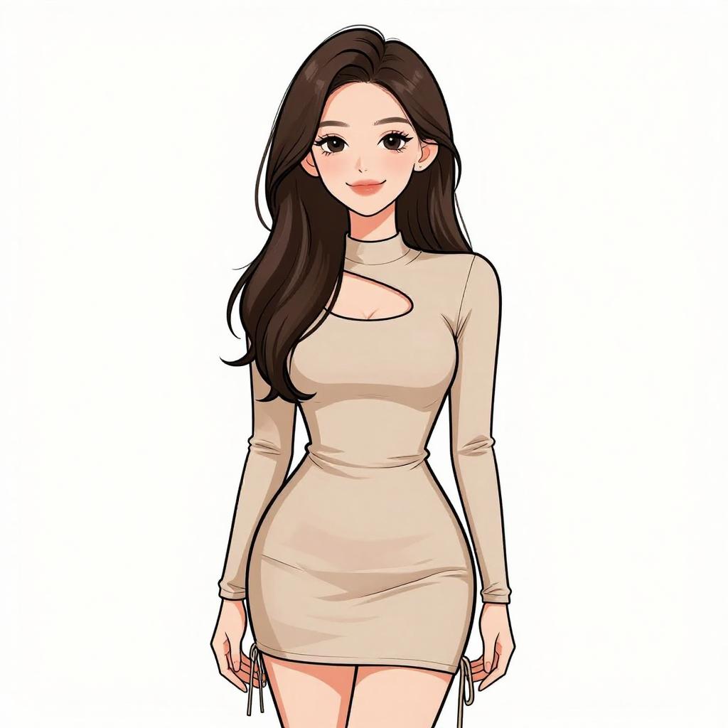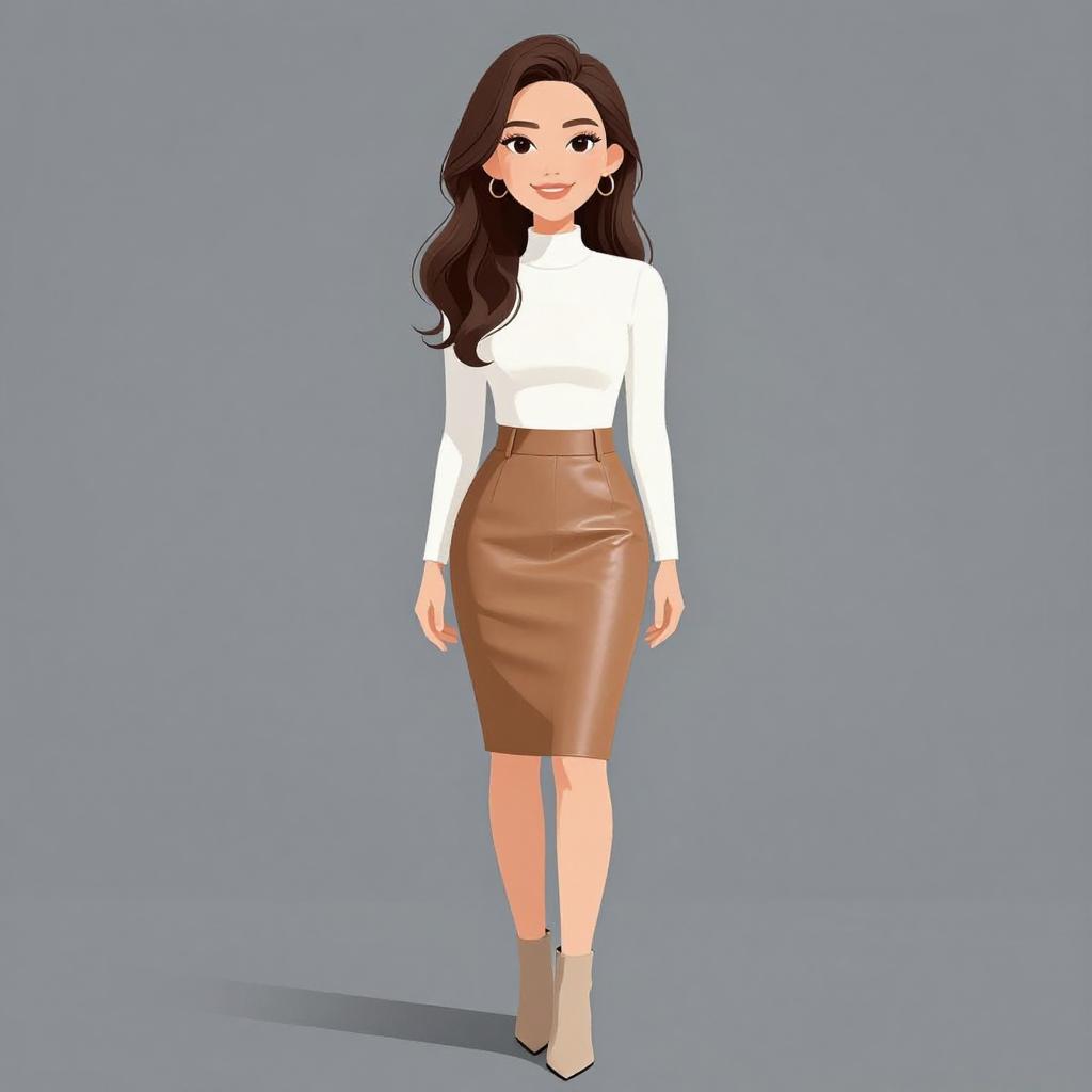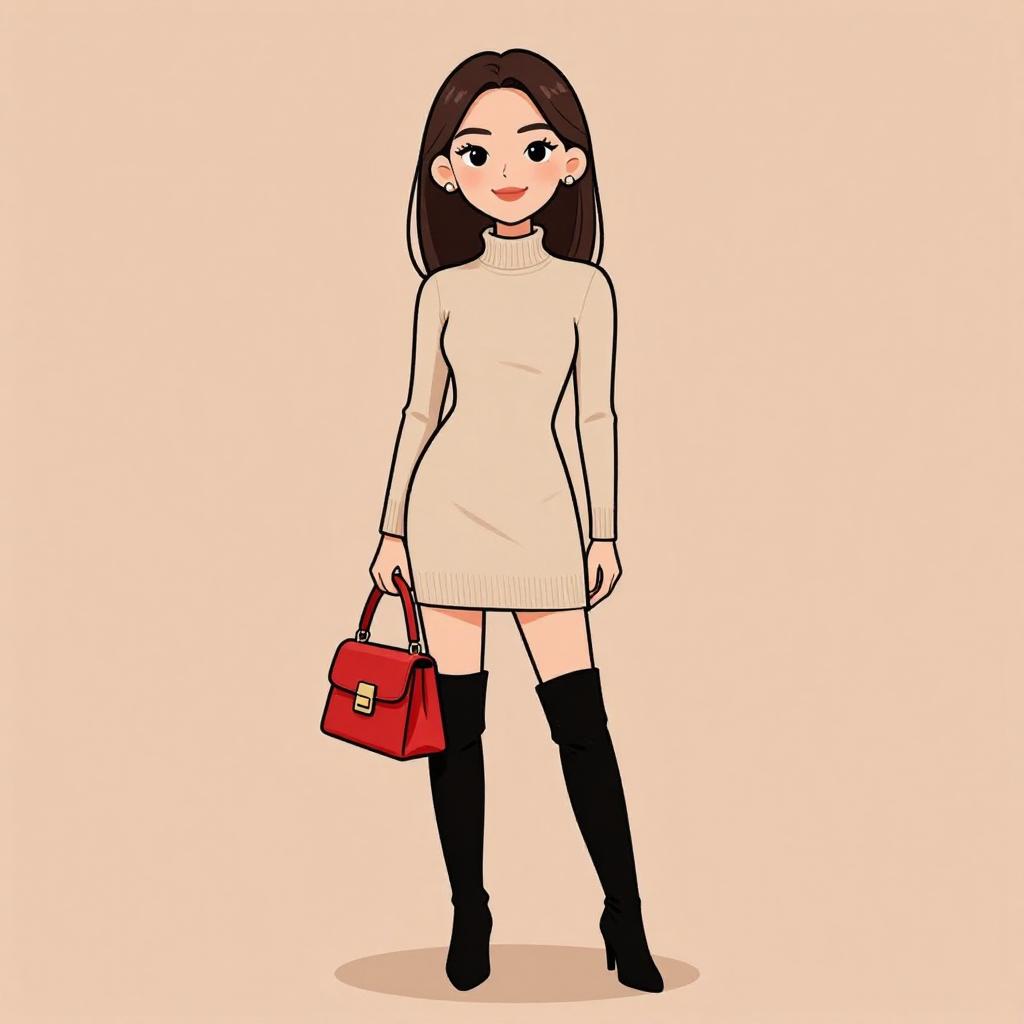 Woman with pretty face and pretty hair. smiling Woman, minimalist, fitted knit dress in beige, turtleneck, long sleeves, short hemline, black over-the-knee suede boots, red structured handbag with handle, stud earrings, sleek straight hair, photo studio background. --sref 1467