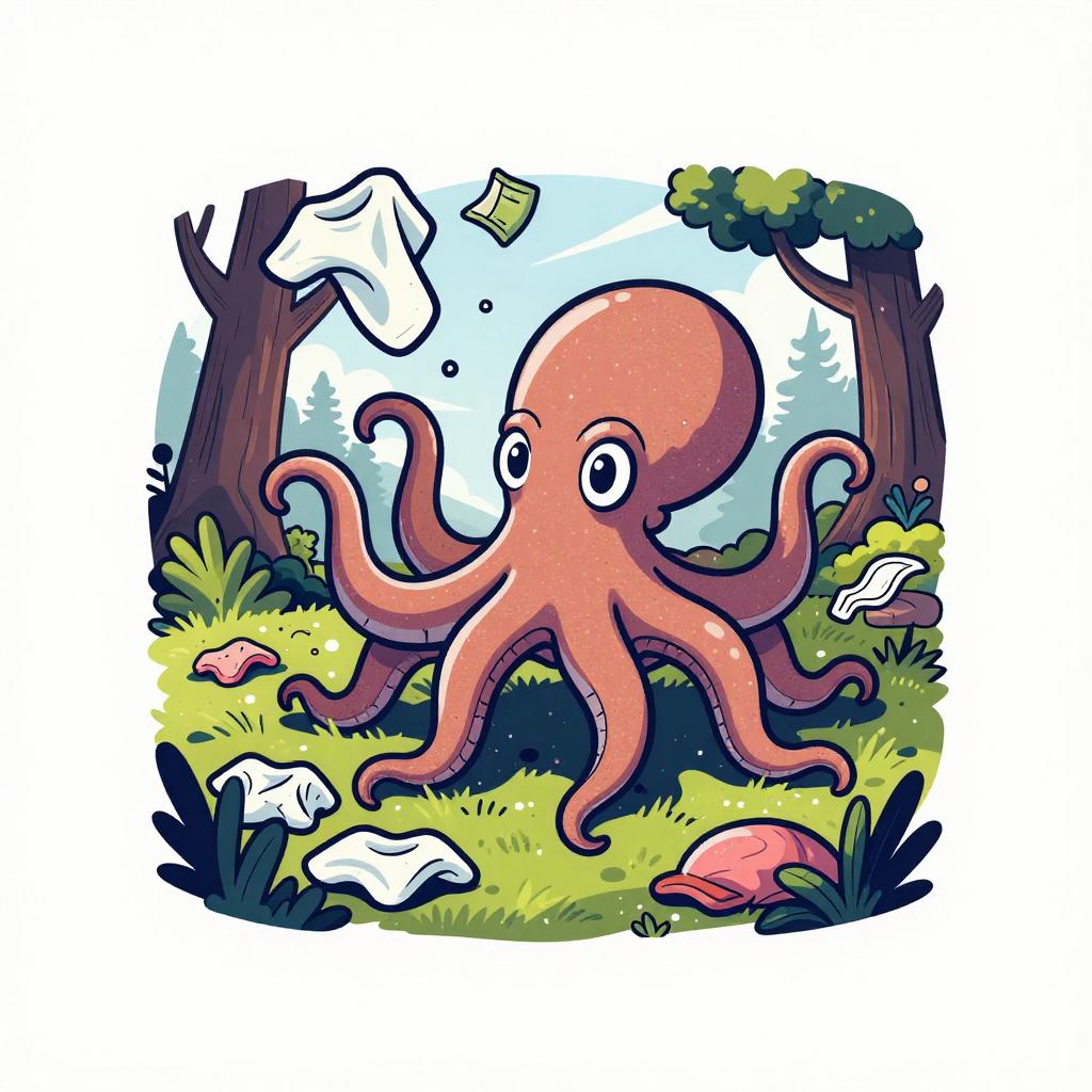 A cartoon illustration of a curious septopus-like laundry glove with many playful fingers causing laundry items to scatter in a whimsical fantasy forest laundry clearing, conveying a magical and lively vibe under dynamic lighting. Vector T-shirt graphic, bold contour lines, flat colors, white background.