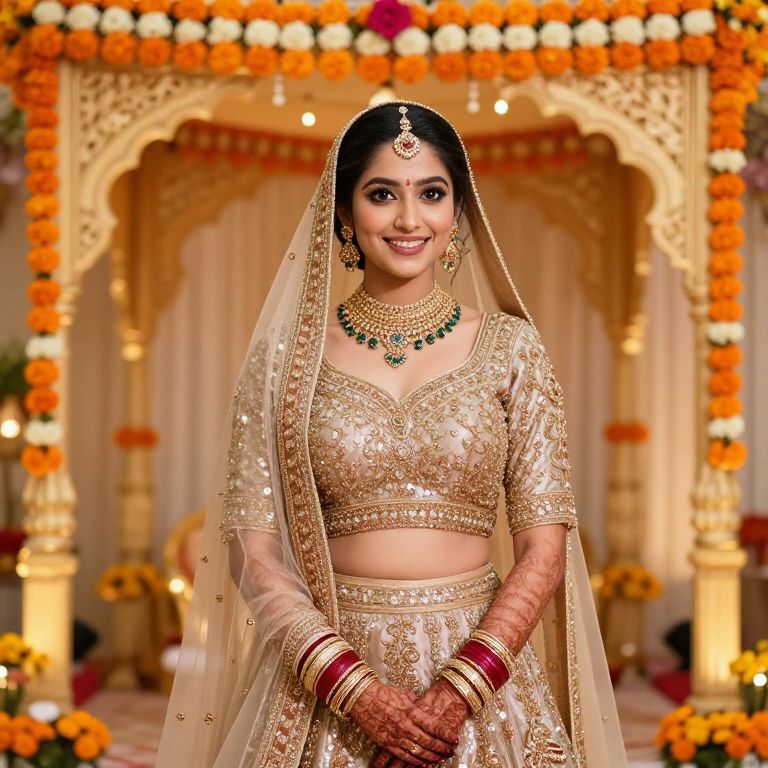 A young bride with round, expressive brown eyes and a radiant smile wearing a stunning piece lehenga with gold embroidery and sequin detailing, standing in a grand wedding mandap under a canopy of orange and white marigolds, surrounded by traditional Indian wedding decorations.