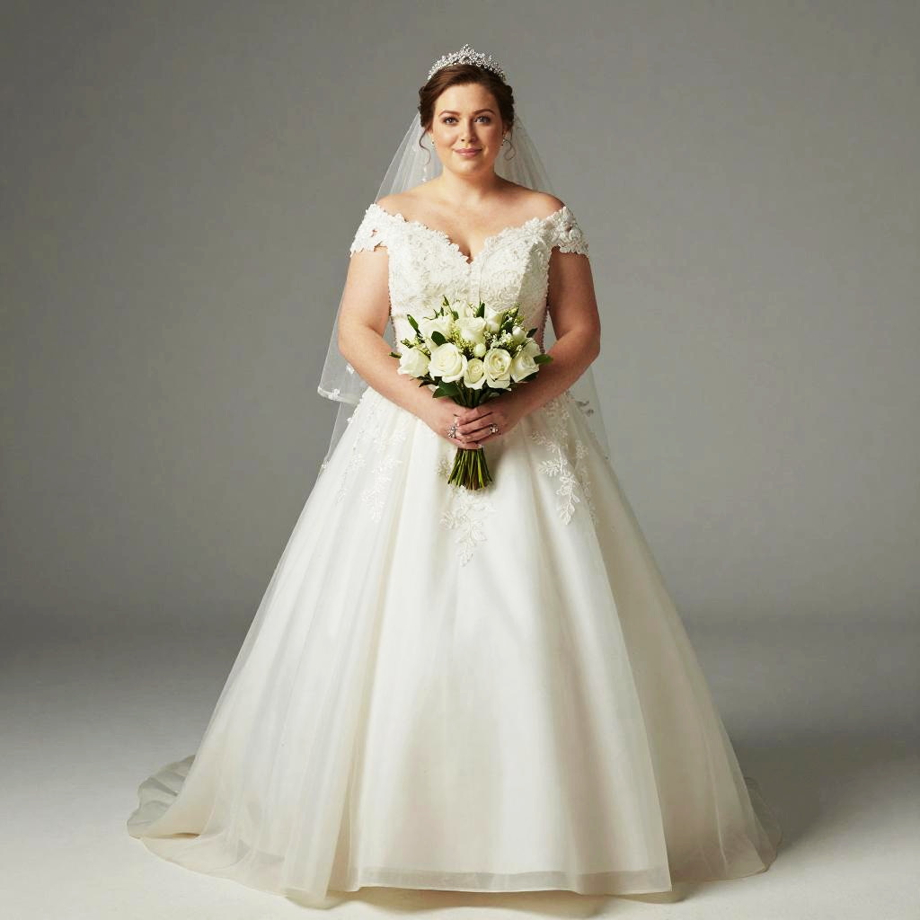 Portrait of a plus size bride wearing an off-shoulder, lace-embellished white wedding dress with a full skirt. She holds a bouquet of white roses and greenery, and wears a tiara and veil. The background is a plain, neutral gray studio setting.