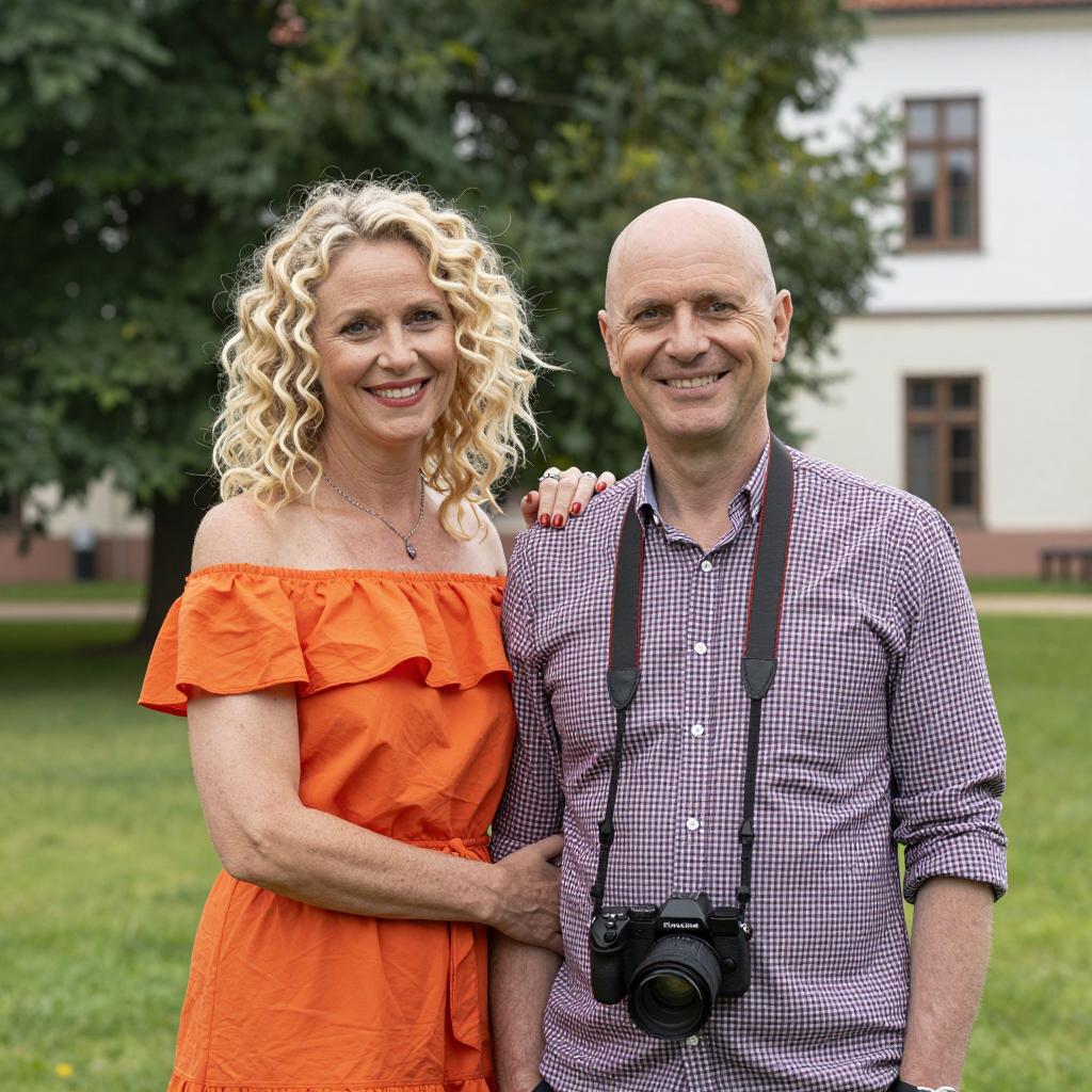 Black and white image of a man and woman standing near a wooden structure by water. The woman with dark hair in a ponytail wears a floral sleeveless top, facing right profile. The bald man in a short-sleeved t-shirt smiles while holding a camera, extending his arm towards the woman. The background shows trees and a calm water body.