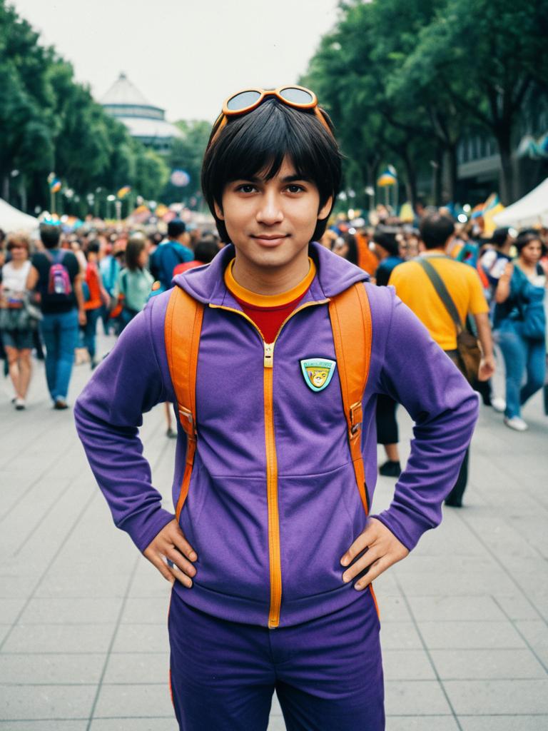 Man in Dora Explorer costume, cosplay festival portrait, cinematic realism