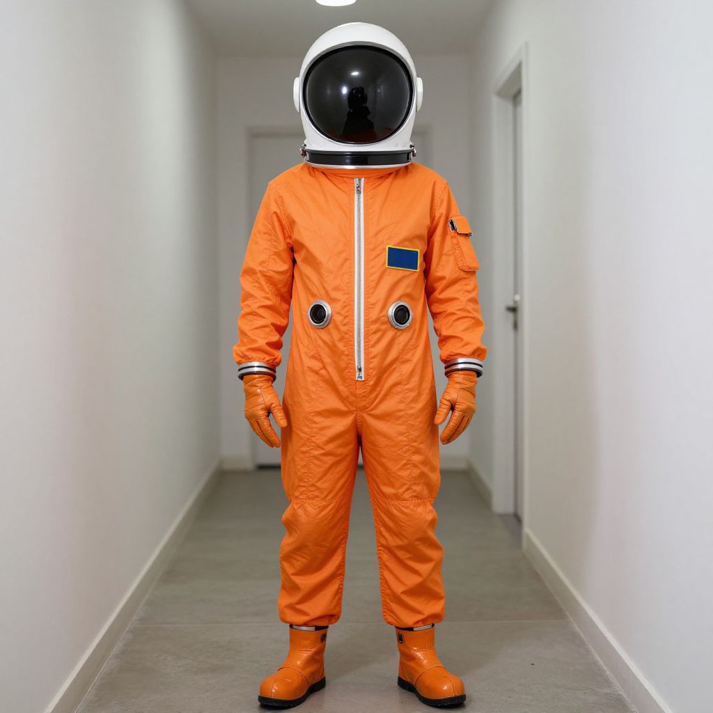 Homemade Space Costume, astronaut in orange spacesuit standing in a hallway