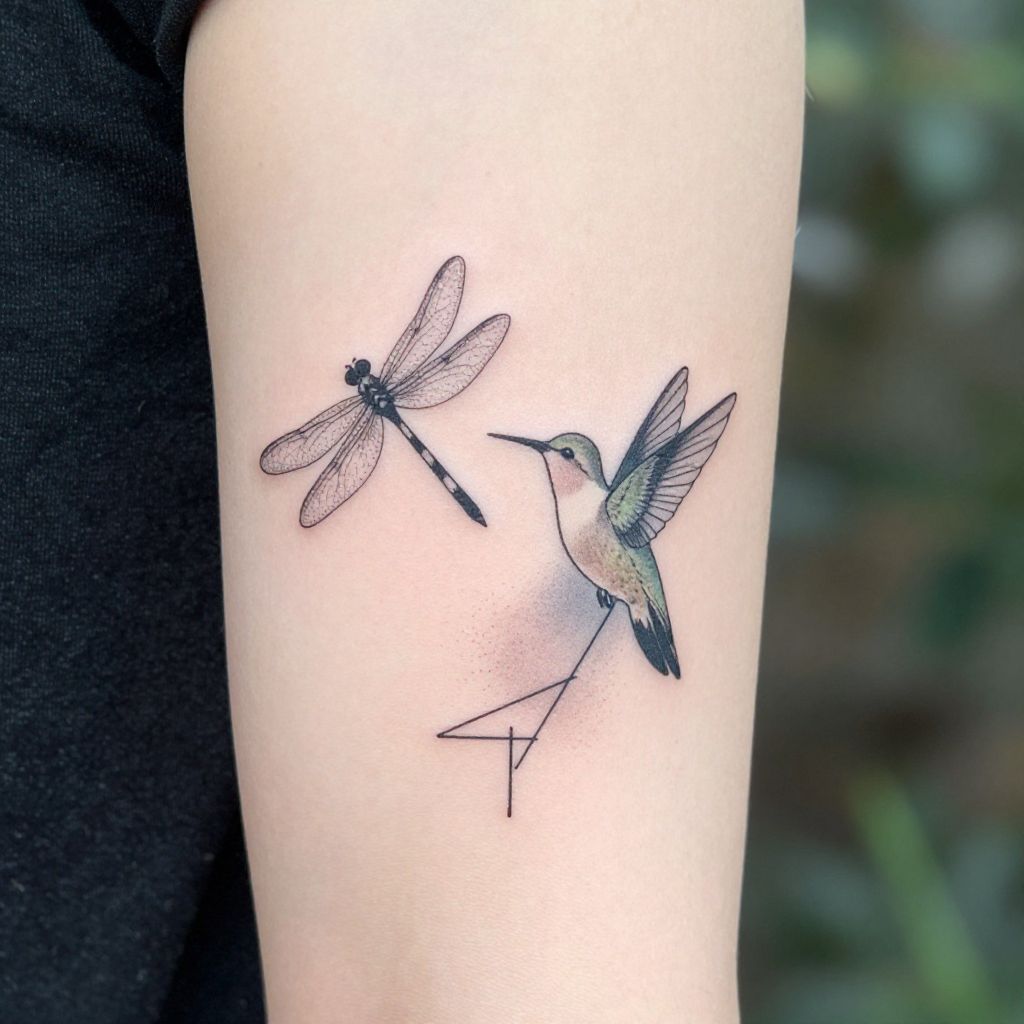 Minimalist dragonfly and hummingbird tattoo with fine geometric shapes and soft dotwork, incorporating subtle gradients and simple lines to evoke elegance and freedom, arranged symmetrically for a modern and tasteful tattoo design.