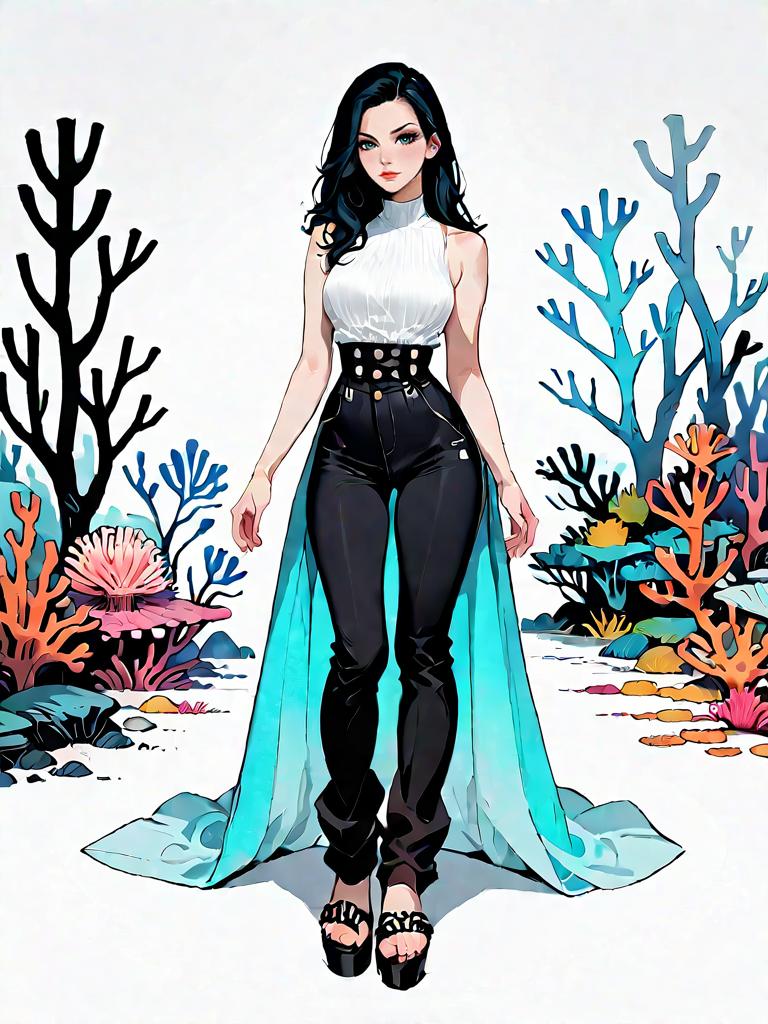 1girl, source_comics, realistic face, full body shot, Woman, minimalist chic, coral sleeveless jumpsuit, high neckline, fitted waist, straight-leg pants, open-back detail, black strappy platform sandals, white studio background with natural light and shadow play.