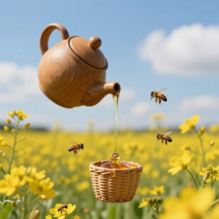 Wooden teapot suspended mid-air pours golden honey from its spout, surrounded by buzzing bees collecting droplets into basket-like containers amidst a vibrant field of yellow wildflowers and a serene blue sky dotted with fluffy clouds.