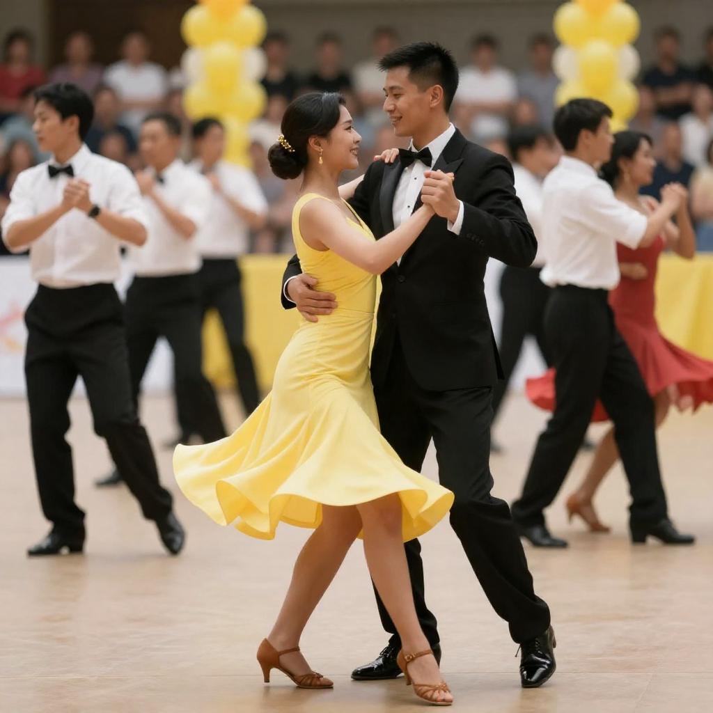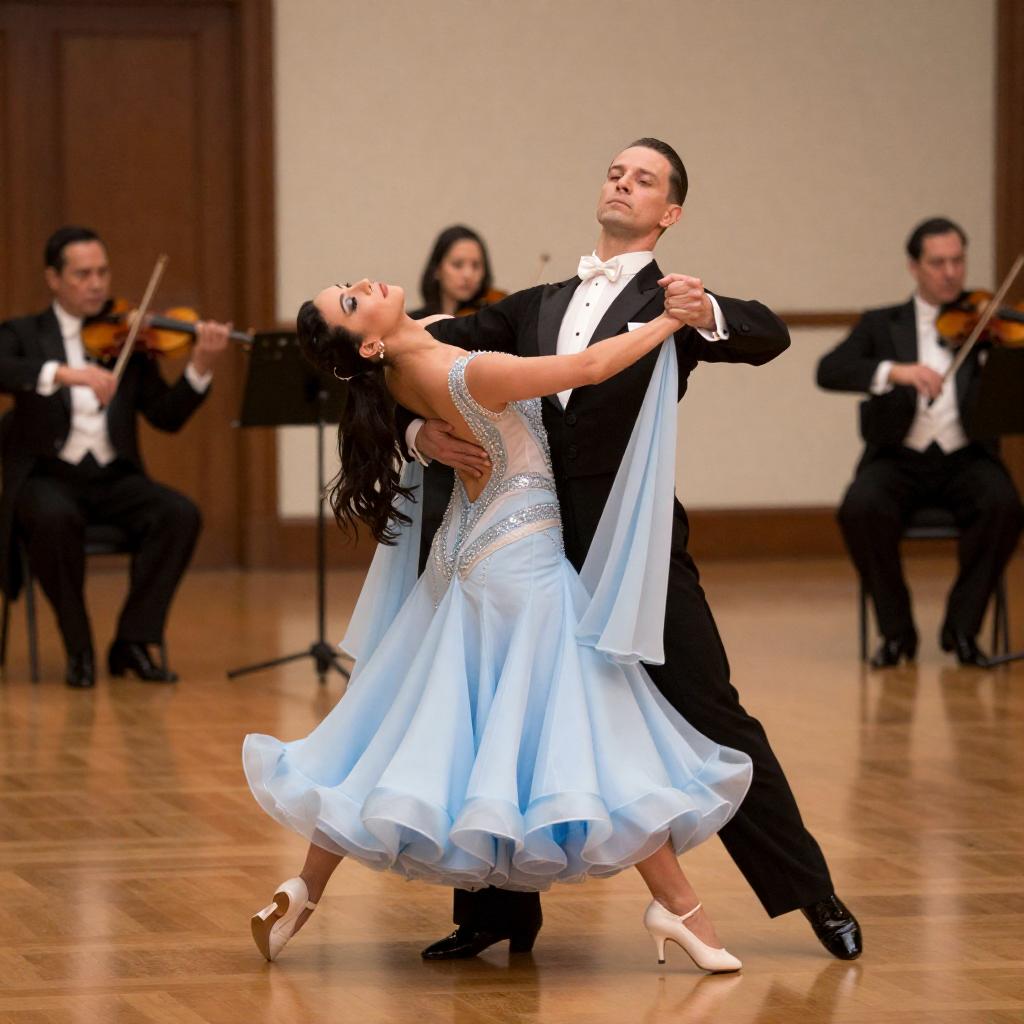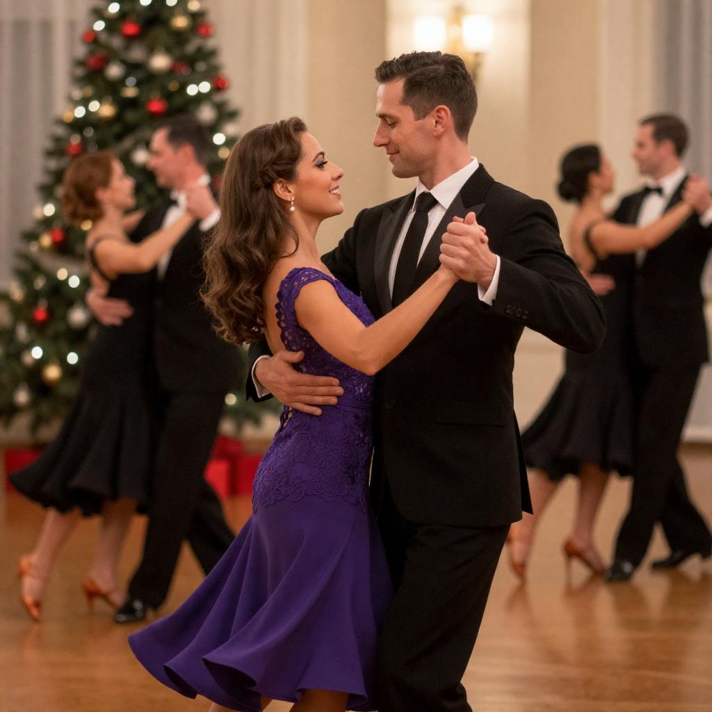 Couple dancing in front of a decorated Christmas tree, man in vest and checkered shirt, woman in red lace dress, smiling, holding hands, tree with white lights and ornaments, man with short brown hair, woman with long black hair, other man in red shirt, wooden floor, white walls with tree branches.