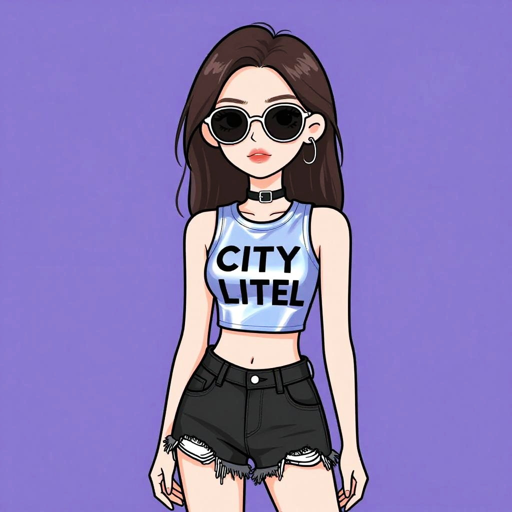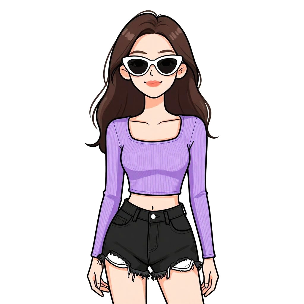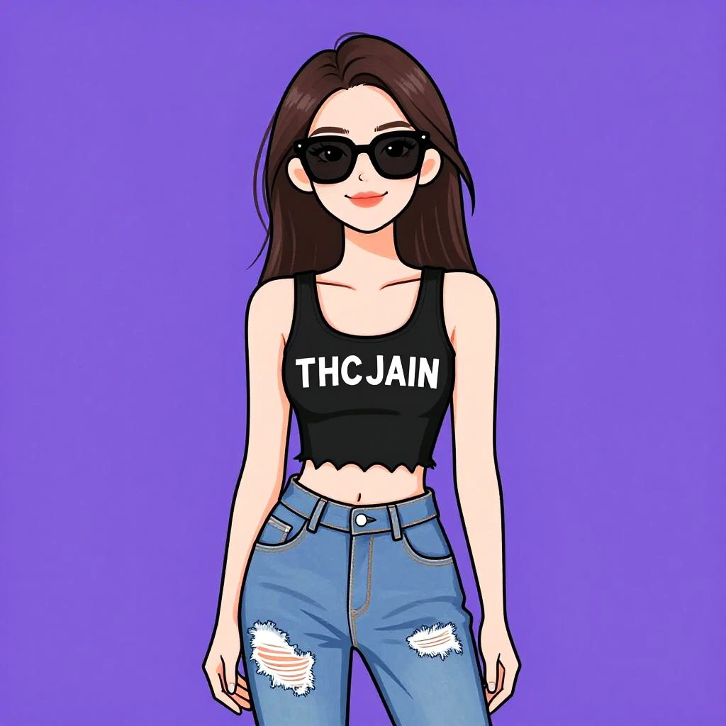 Digital drawing of a young woman with long, straight brown hair and fair skin, wearing black, oversized sunglasses, a black sleeveless crop top with "THCJAIN" in white letters, and blue, high-waisted, ripped jeans with white patches on the thighs. She stands against a solid purple background, looking forward with a slight smile. The art style is bold with thick outlines and flat colors, reminiscent of modern digital illustrations. The overall composition is simple and focuses on the subject, with no additional objects or scenery.