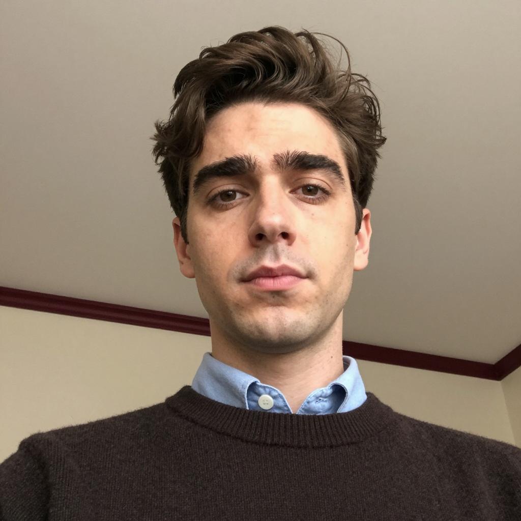 Portrait of a young Caucasian man with brown hair and dark eyebrows, wearing a dark brown sweater over a light blue shirt. He has a neutral facial expression and is looking slightly upwards. The background features a beige ceiling with a maroon trim line.
