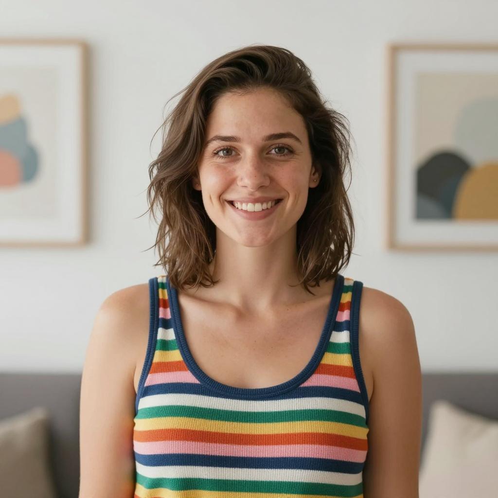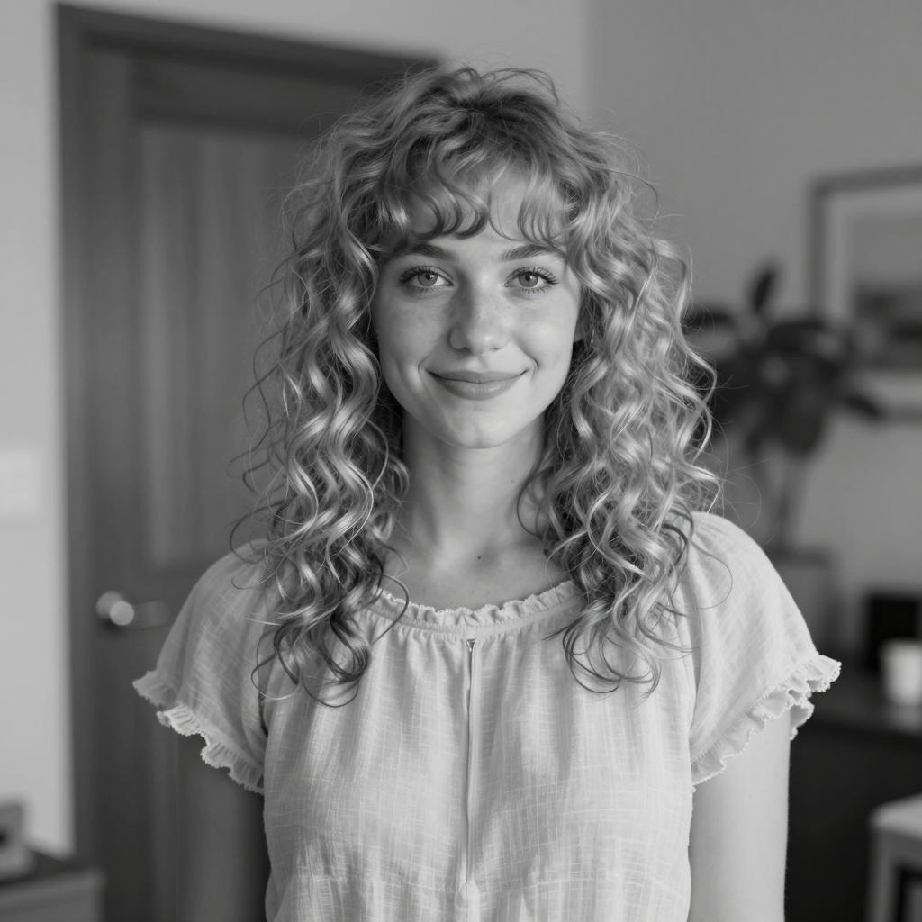 Portrait of a young woman with curly blonde hair and bangs, smiling slightly. She is wearing a light-colored, semi-sheer dress with frilled edges and wooden buttons. The background includes a wooden door and blurred indoor plants, creating a warm indoor setting.