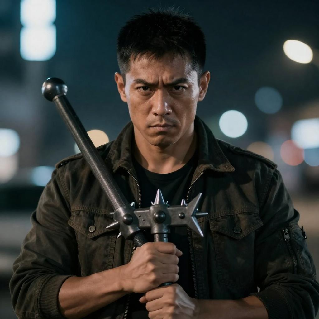 Muscular man with dirty white tank top and brown pants, crouching with intense expression, holding large silver tool in right hand. Background: industrial machinery with pipes, valves, and control panels. Man's left hand touches metal platform. Dimly lit room.