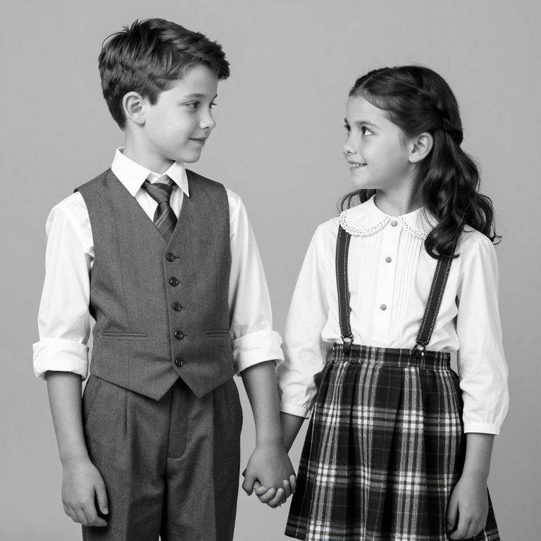 A black and white studio photo of a young boy and girl holding hands, dressed in vintage clothing.
