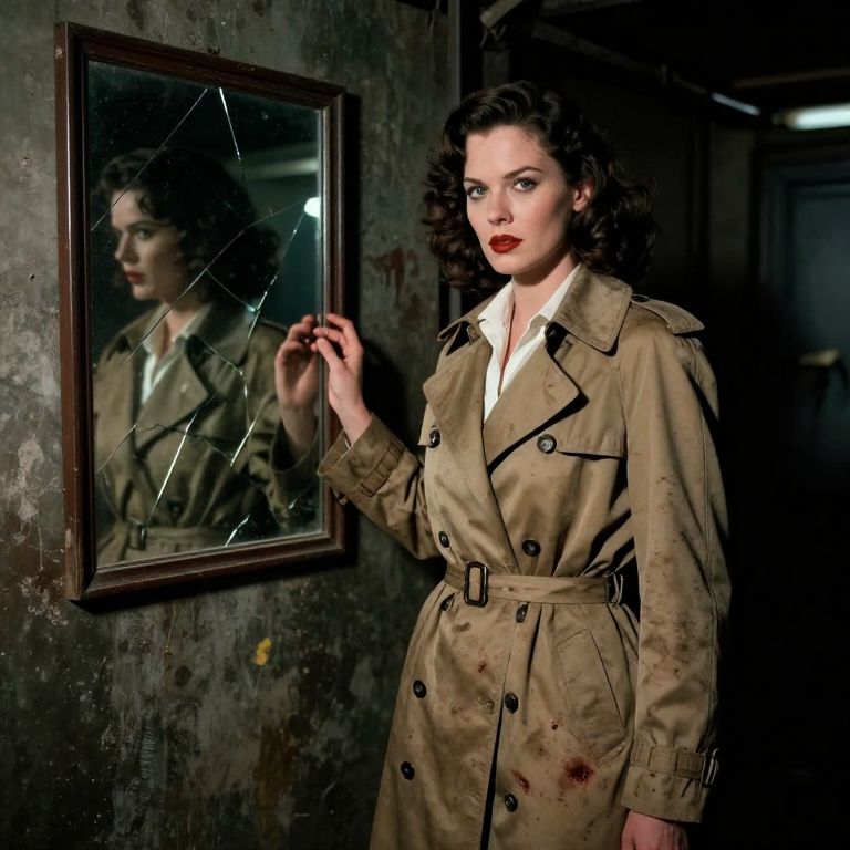 A fearless 1930s trench coat heroine with a sharp jaw, determined eyes, and a commanding presence stands in a dimly lit basement at a crime scene, the trench coat stained with dust and old blood, her gaze locked on a broken mirror reflecting a shadowy figure, the noir atmosphere heavy with danger and hidden truths
