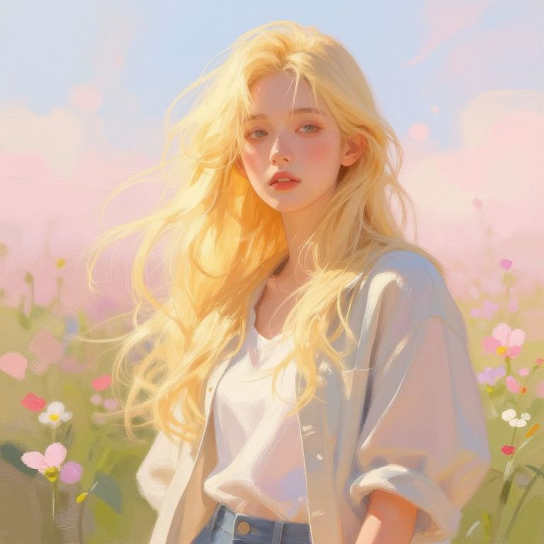 How I would look with blonde hair, artistic digital painting of a person with long flowing blonde hair under soft sunlight, wearing casual chic attire, serene expression, background of blooming flowers and pastel sky, impressionistic brushstrokes, vibrant yet gentle colors