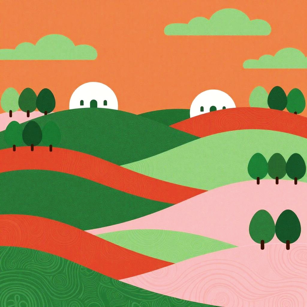 This is a colorful, digital art piece featuring a stylized, layered landscape. It has vibrant greens, reds, and pinks with bold, geometric shapes. Rolling hills and trees fill the middle, while two white, dome-topped buildings sit atop the hills. The sky is bright orange with green clouds. The bottom has intricate, wavy patterns in green, red, and pink. The overall style is surreal and abstract.