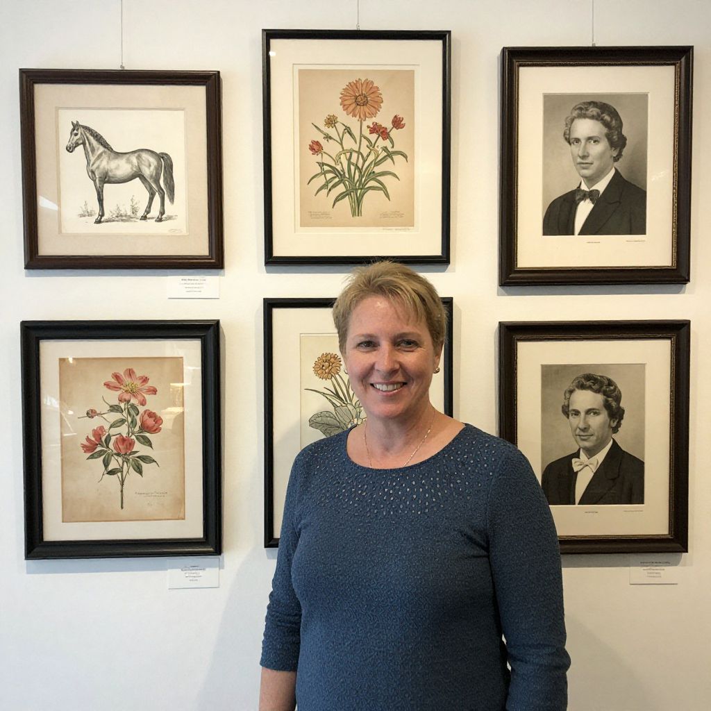 Smiling woman standing in front of a gallery wall featuring seven framed artworks, including a horse illustration, floral prints, and portraits, at the Lancaster's Toowoomba Antique Centre, Railway Street, November 2017.