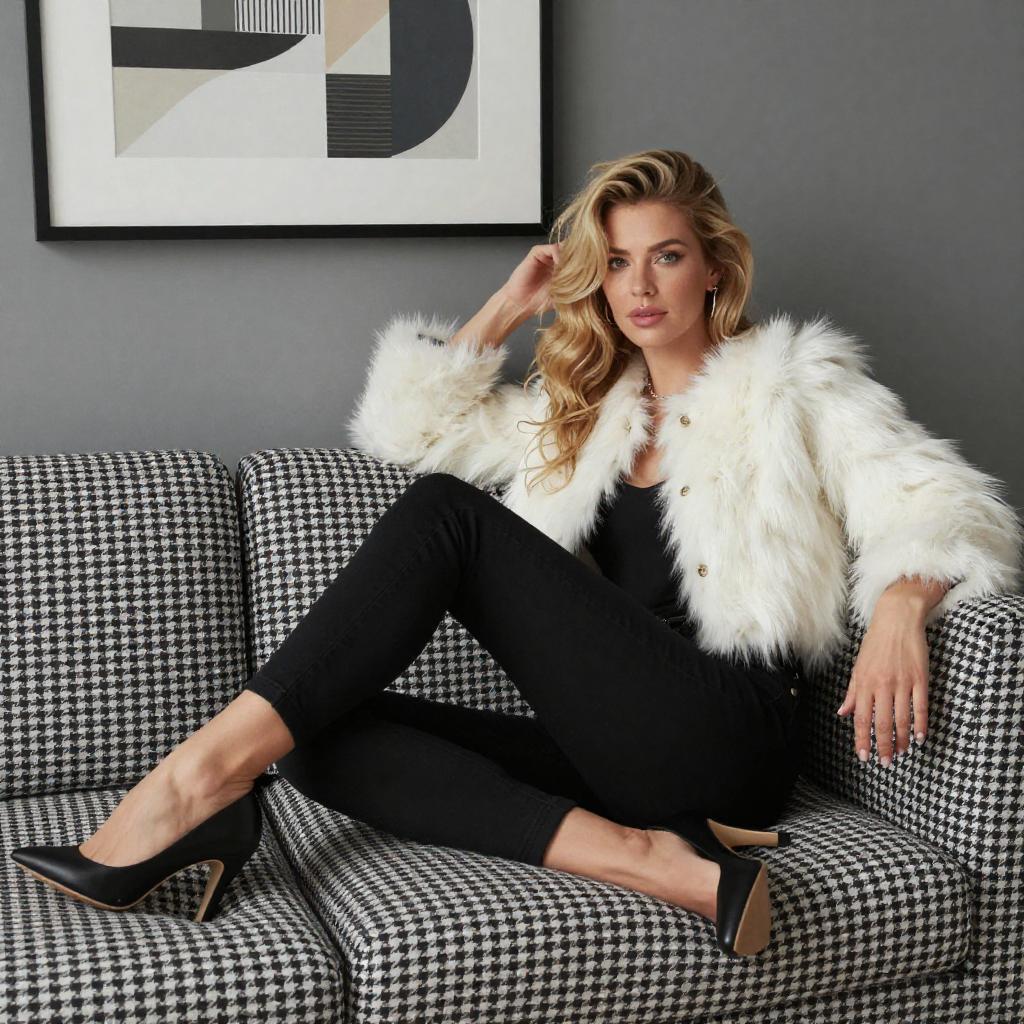 Photograph of a blonde woman with wavy hair, wearing a black, long-sleeve, polka-dot top and shiny black pants with high-heeled boots. She kneels on one knee, hand in hair, against a white tiled wall and speckled floor. Her expression is confident and slightly sultry.