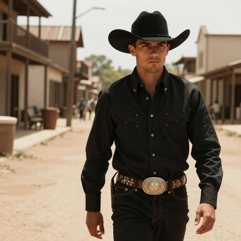 Cowboy outfit black, classic western wear with a modern twist, intricate silver belt buckle, wide-brimmed hat, dusty old town street, warm tones, photorealistic