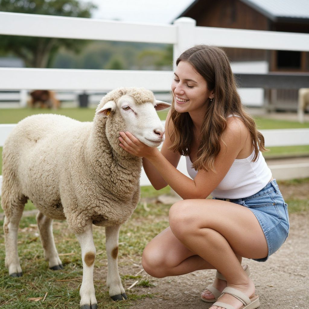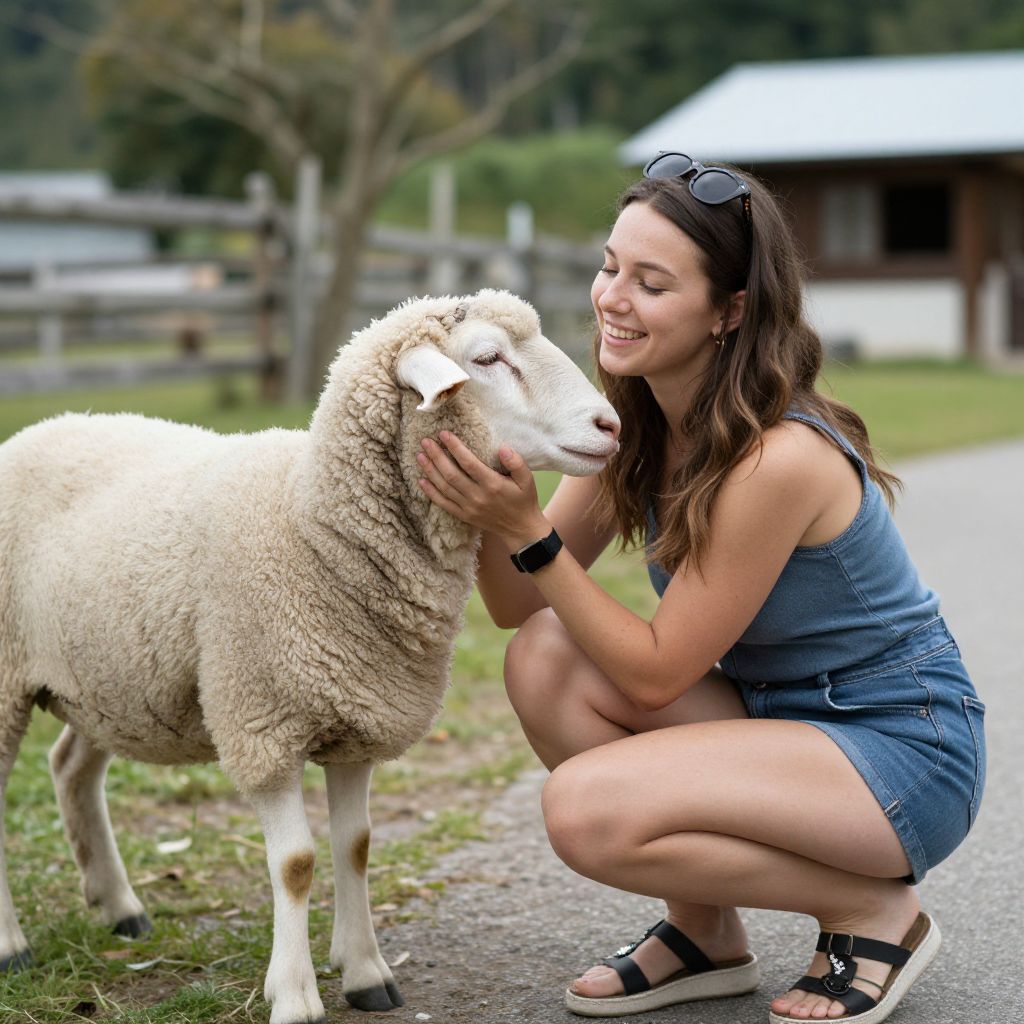 Smiling woman crouching beside a fluffy sheep, gently petting its face in a serene outdoor setting at Swiss Sheep Farm in Pattaya.