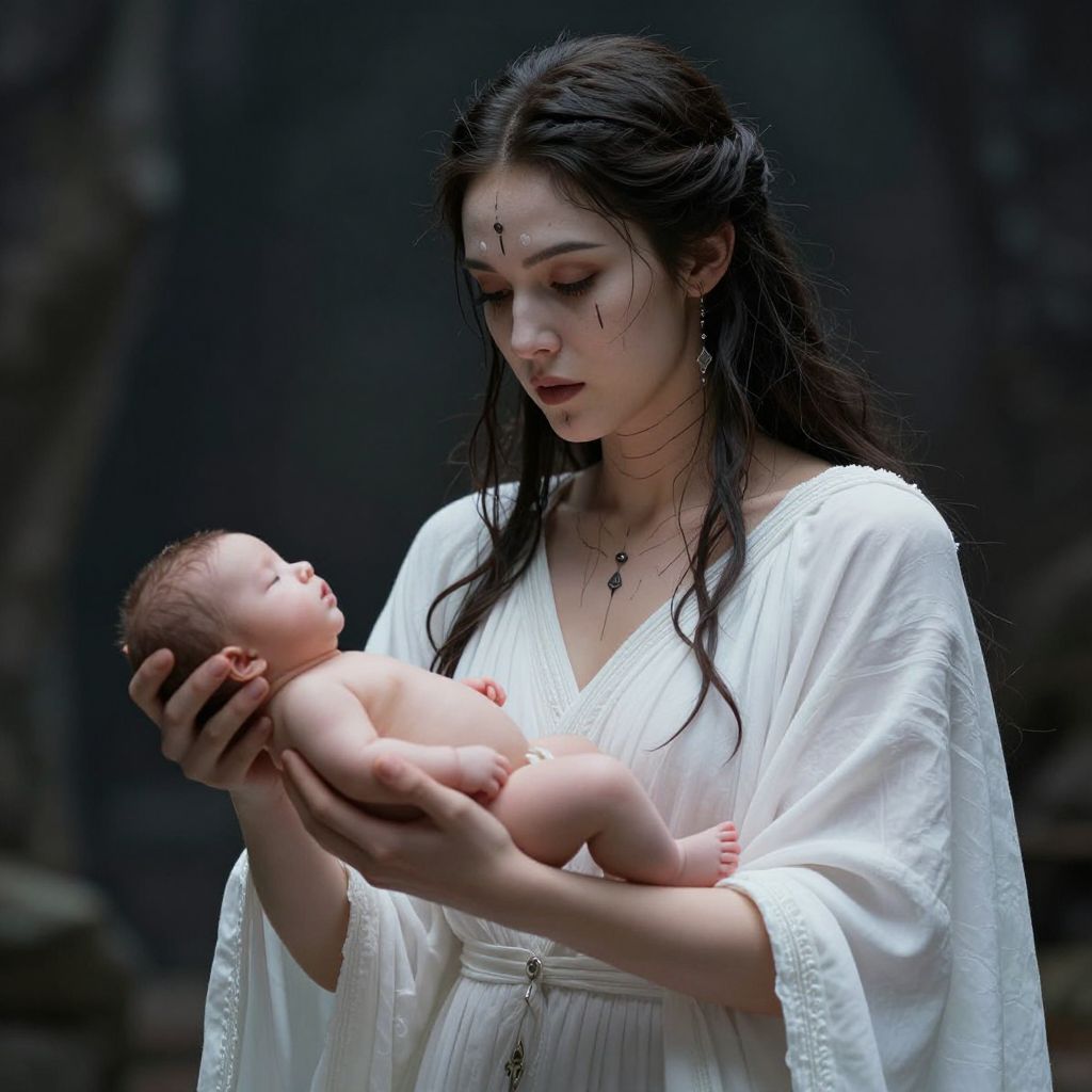 Photograph-like digital artwork of a pale-skinned, dark-haired woman with long, wet hair, wearing a white, loose-fitting robe with intricate lace details. She gazes at a newborn baby with light skin and dark hair, cradling the baby gently in her arms. The woman has a small, decorative dot on her forehead and wears dangling earrings. The dark, blurred background contrasts with the bright white of her robe and the baby's skin. The image has a mystical, ethereal quality, emphasizing the tender bond between the woman and child. The lighting highlights their faces and the texture of the robe.