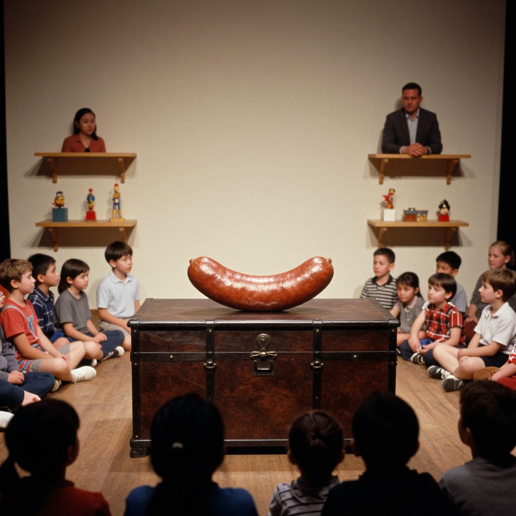 An award winning analog photograph of a stage with a sausage shaped fruit on a chest which is surrounded by lots of people and small, like children and on smaller shelves with a woman and a man. 4 k
