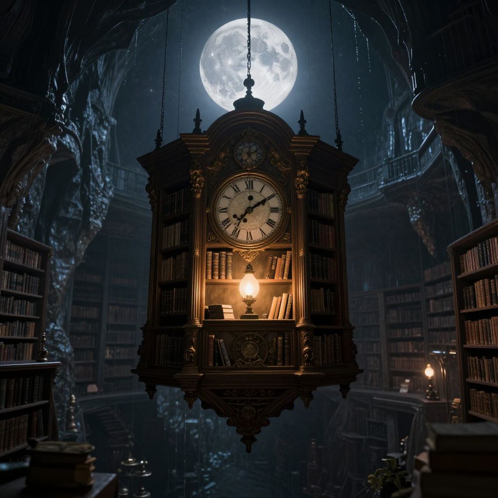 A photograph depicts a dimly lit, Gothic-style library under a bright, full moon. Central to the image is an ornate, antique clock with black and gold detailing, hanging from the ceiling and illuminated by a glowing bulb beneath it. The clock face shows the time as 10:10. Surrounding shelves are filled with dark, leather-bound books, creating a mysterious, shadowy atmosphere. The moonlight casts a bluish hue over the scene, contrasting with the warm light of the bulb. Cobwebs hang from the ceiling, adding to the eerie, old-world charm. The overall mood is haunting and atmospheric.